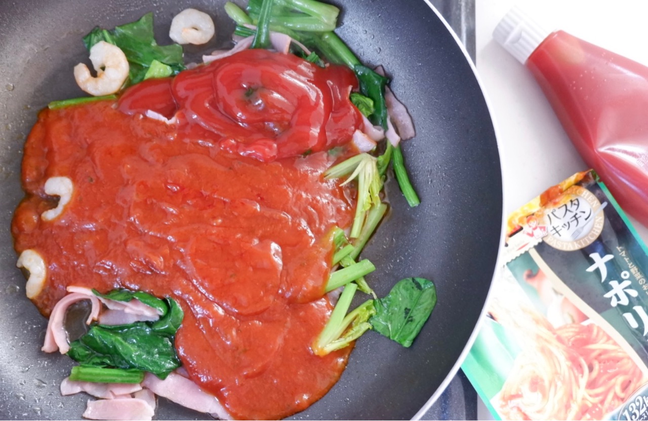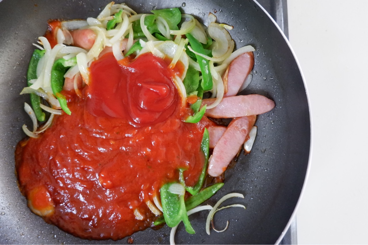 レトルトのナポリタンソースにケチャップを足すだけ。