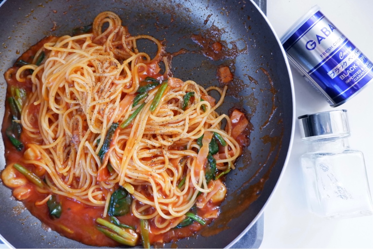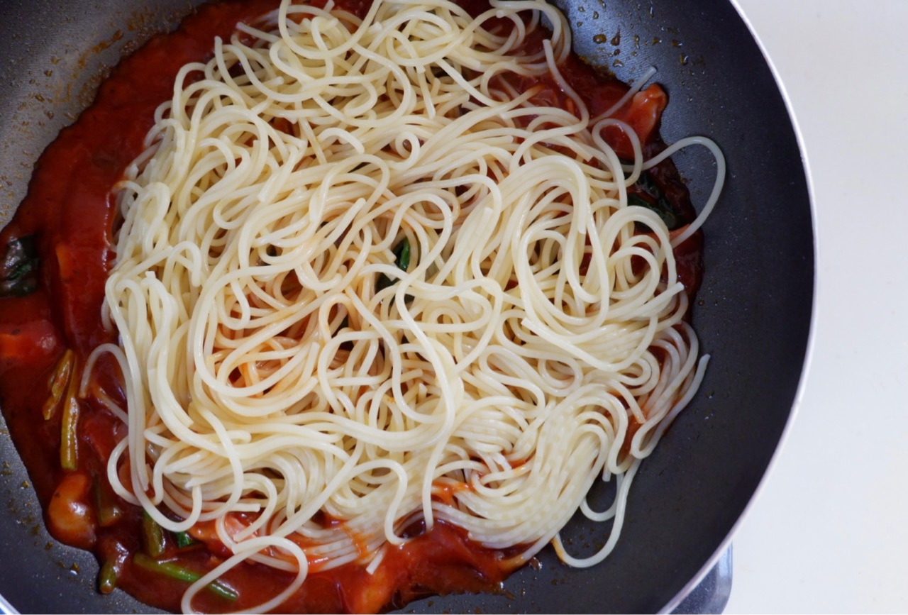 4.ソースが温まったら茹でたスパゲッティーを入れる。