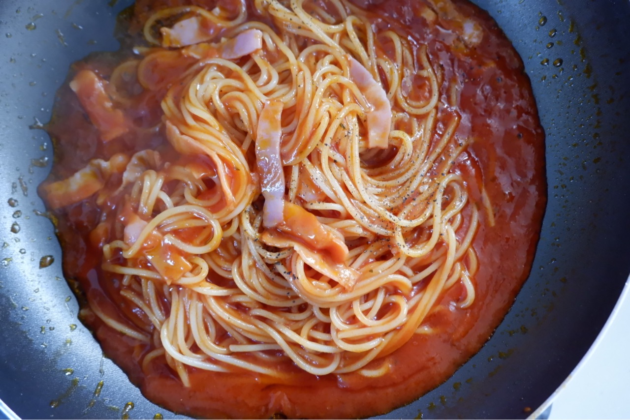 ベーコンを炒めて、ナポリタンソースとスパゲッティーを入れる。