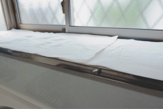 メラミンスポンジ&ダスター(処分するもの)で、キッチンの台や扉、窓もきれいに汚れを落としていきます。