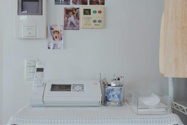 キッチンとダイニングの間にあるスチールラックの上に、FAX付きコードレス留守番電話機を置いていました。