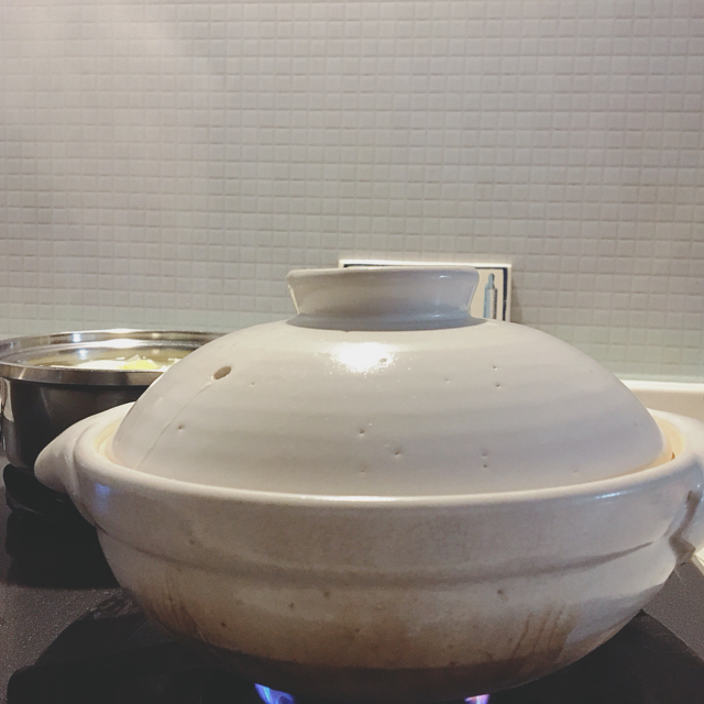 土鍋のフタをして沸騰させると、しばらく空気穴から中の水分が激しく飛びます。