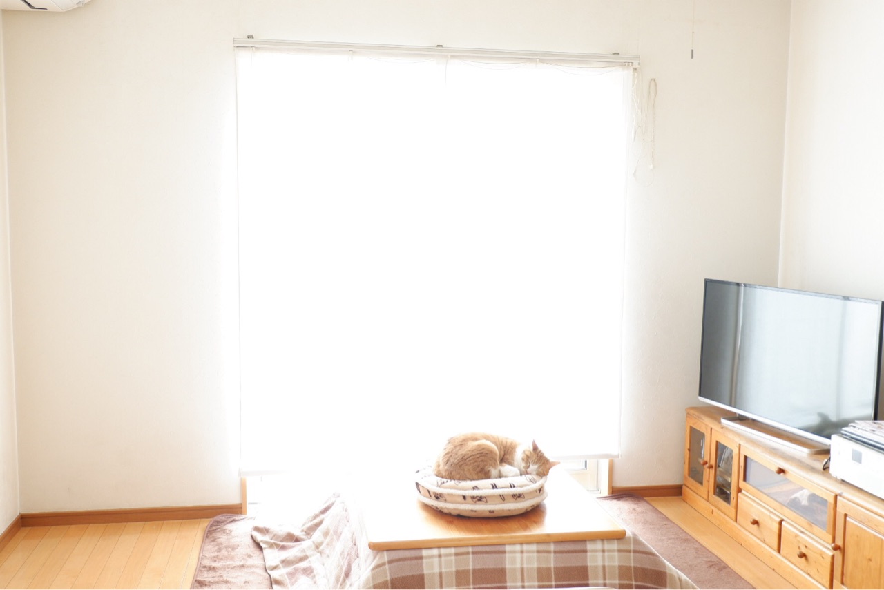 休日夫がこたつテーブルでくつろぐときに、テレビが眩しいので必須のカーテン。