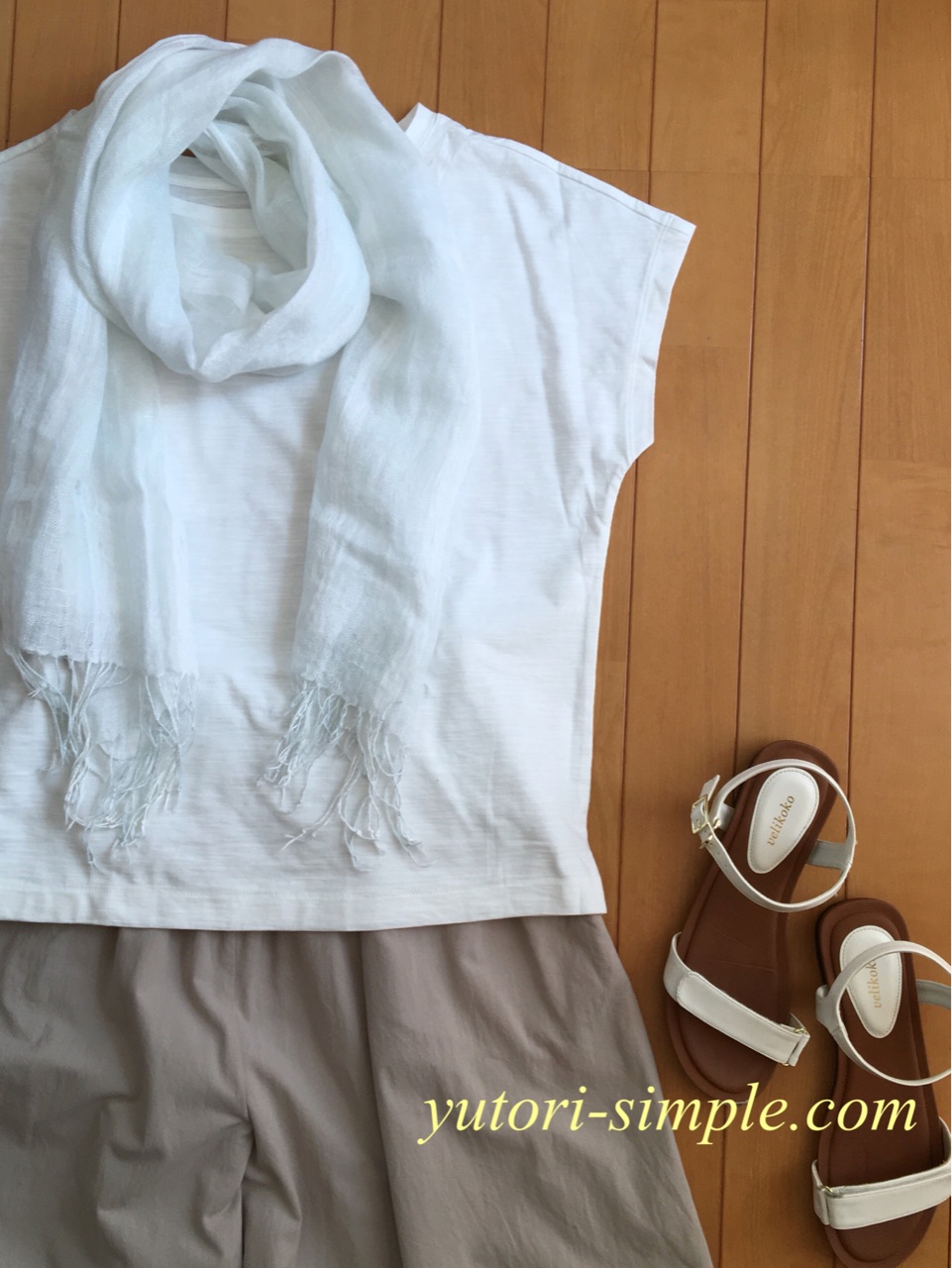 お気に入りの淡い水色と白のリネンのストールを巻いて、爽やかに。