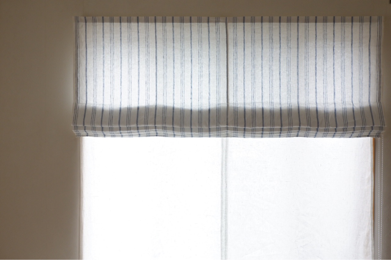 ブルー&ホワイトのリネンの布のカーテンにしました。