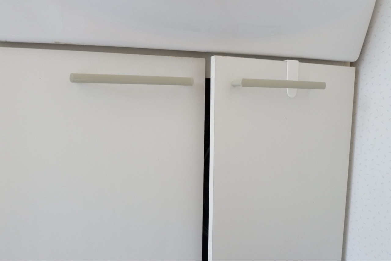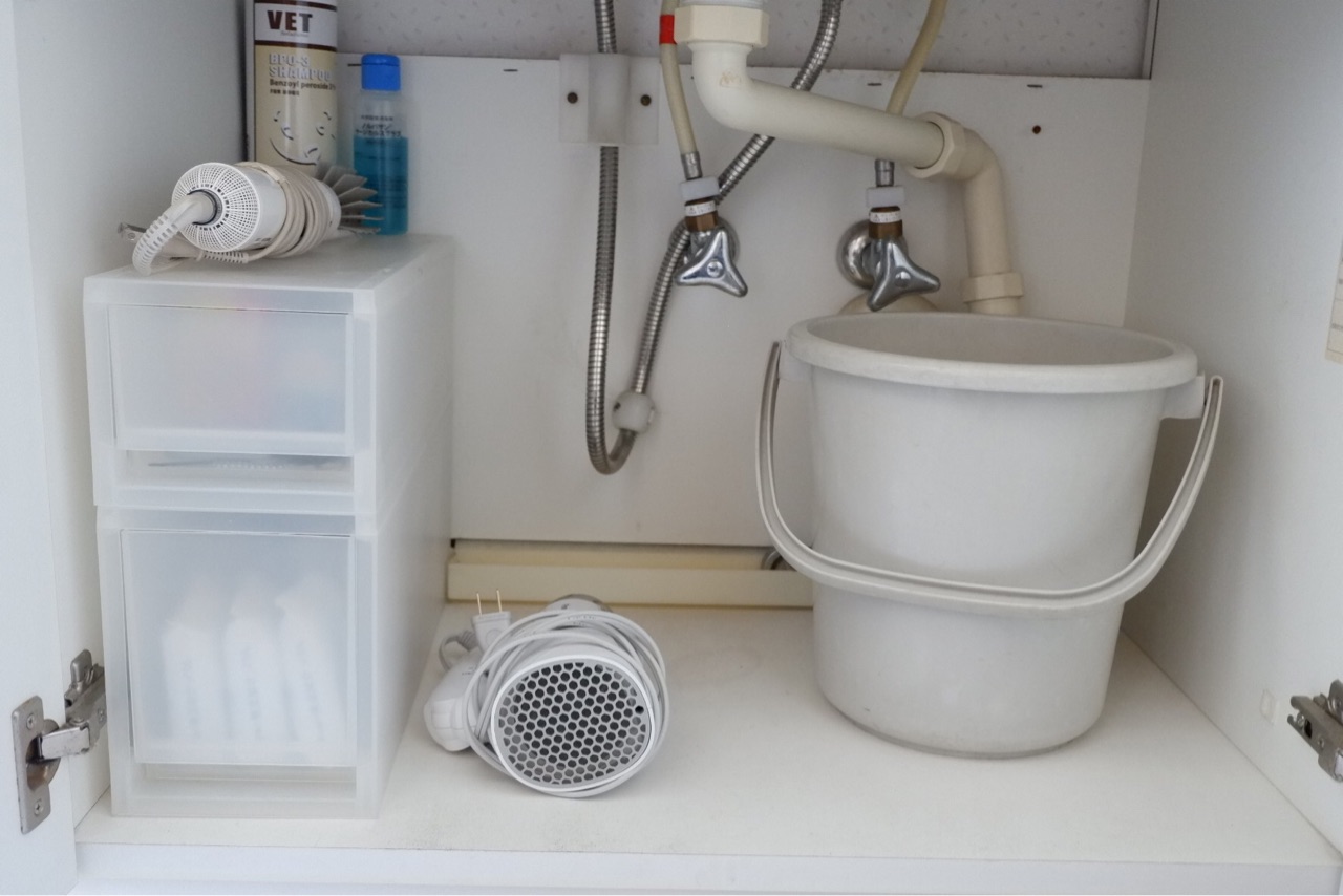 洗面台の下は、今風の便利な引き出しではなくて、観音扉を開けるスタイル。