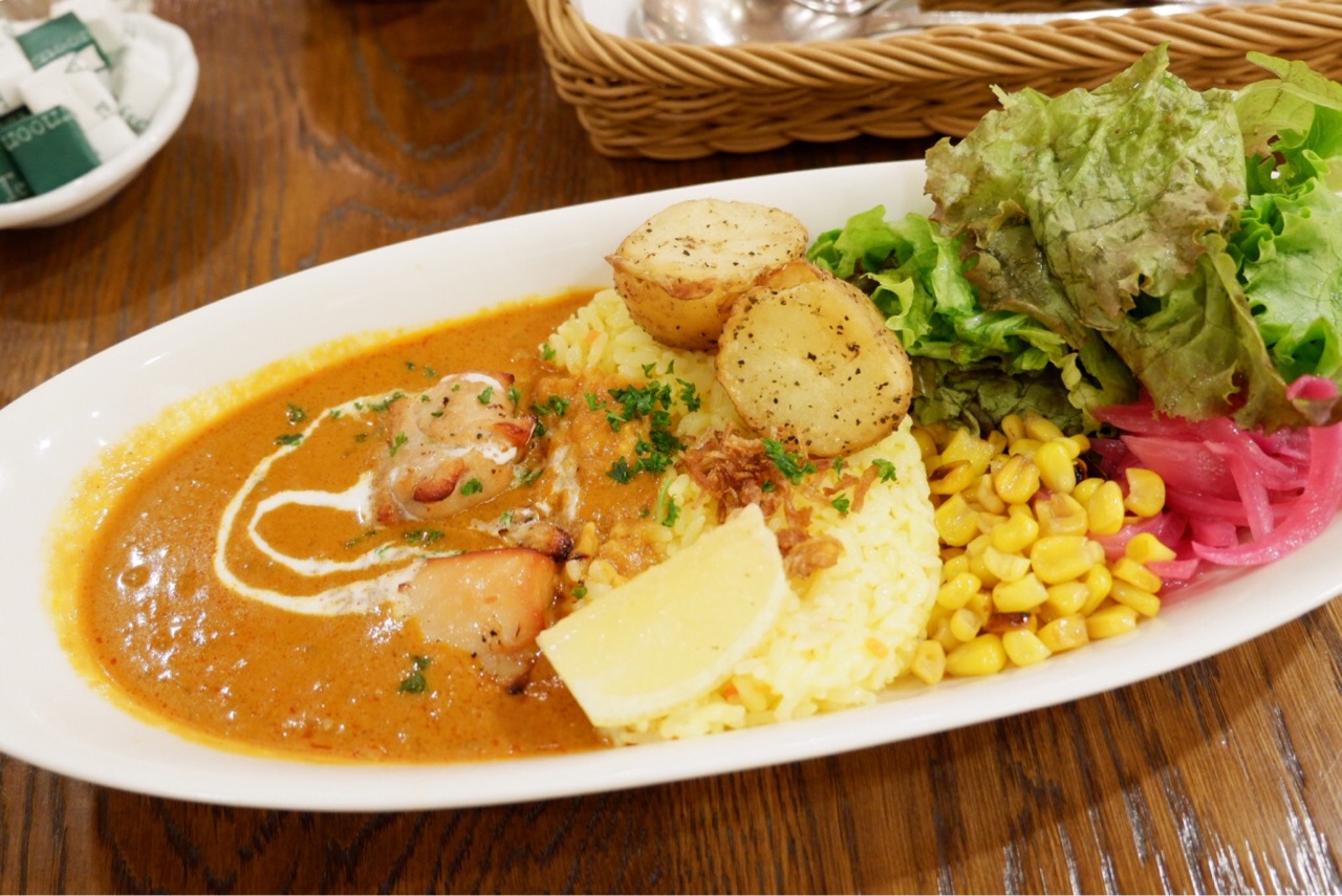 レモンのマーマレードを隠し味に、オリジナルスパイスミックスとアーモンドミルクを加え煮込んだクリーミーなカレー。レモンバターコーン、「カルピス」を使ったレッドオニオンピクルス、ハーブソルトポテトを添えて。