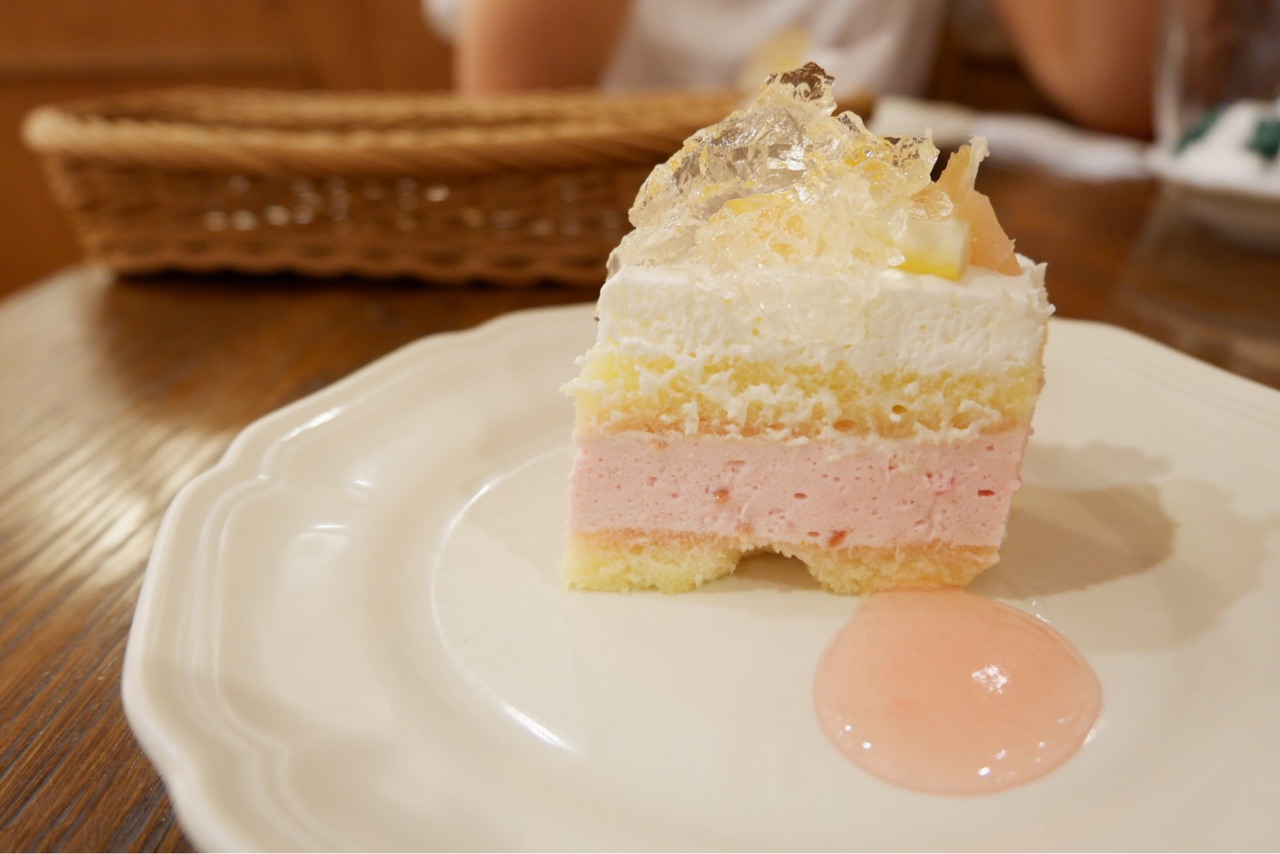 ラズベリー入りのヨーグルトソースをしっとりとしたスポンジでサンドし、2種類のピーチをのせたショートケーキ。ピーチミントの爽やかなジュレをのせて。