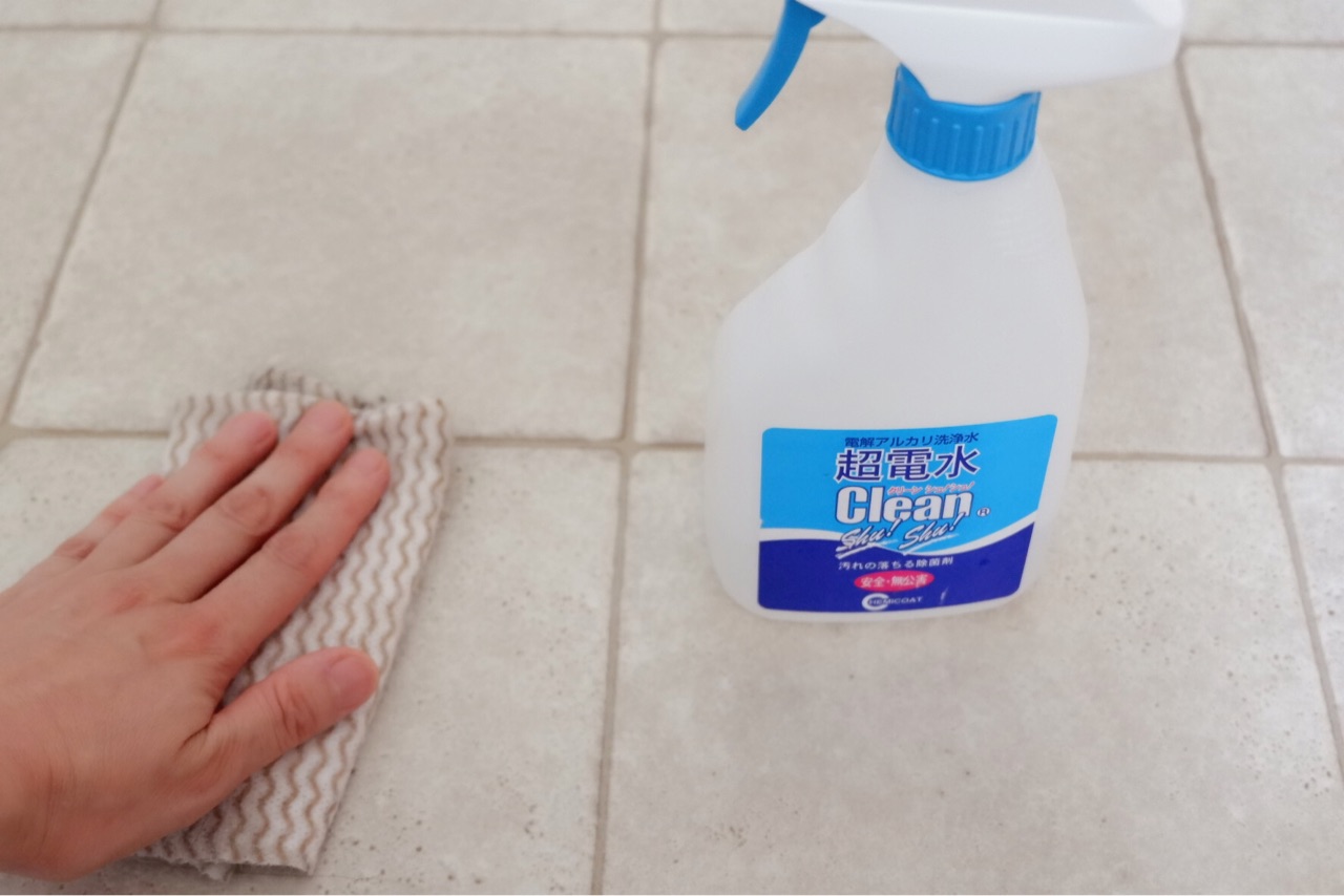 愛用している超電水シュシュで洗面所の壁をふきふき!