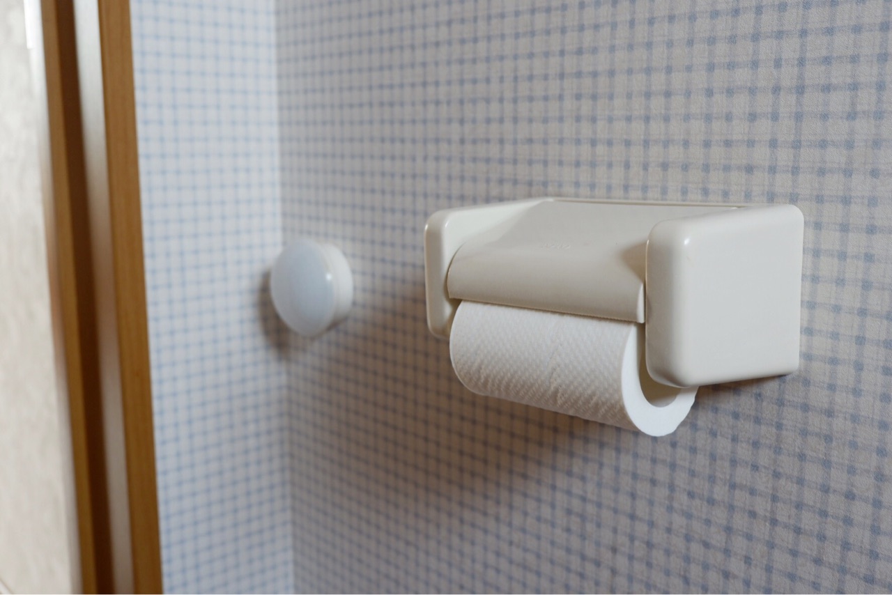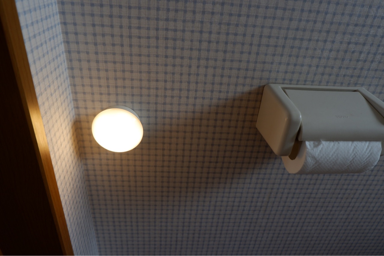 向かって左のトイレットペーパーの横に、IKEAのセンサーライトを貼り付けています。