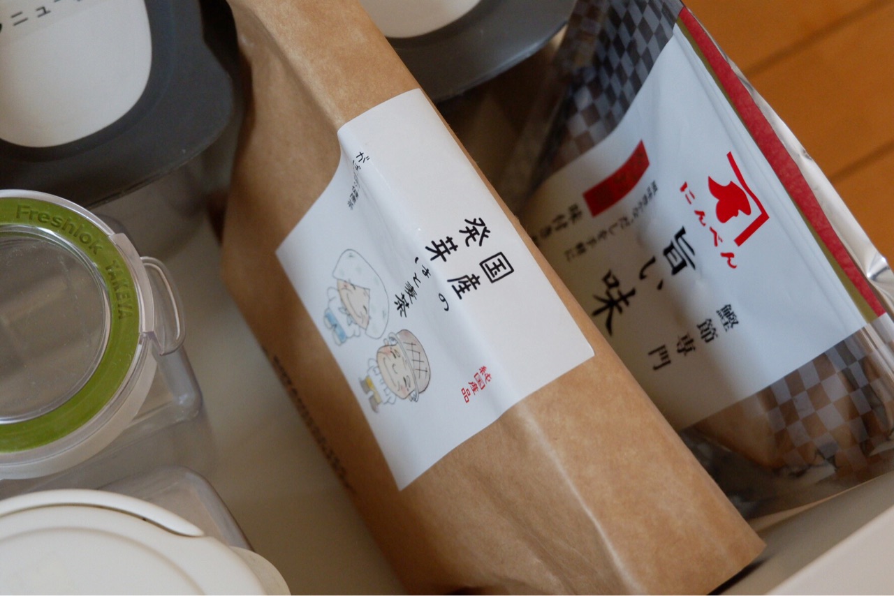 商品名がわかるように、それが入っていた袋の商品名やマークを切り取って貼っています。