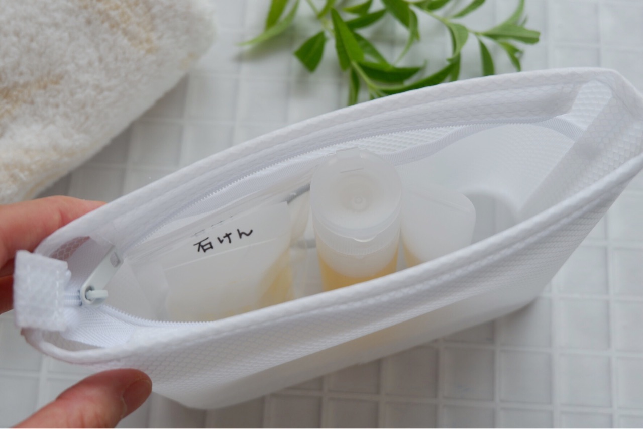 スイミングの後に使うシャンプー類を無印良品の「スパポーチ」に入れてみました。
