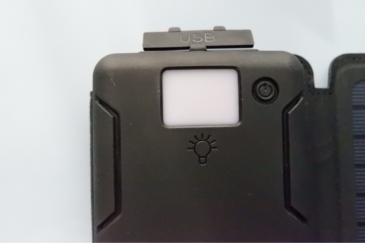 今回、ソーラーパネルの大きさに期待して買った、モバイルバッテリー。