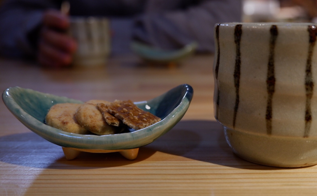 食事が終わると、お茶菓子の奄美大島のごまざた・徳之島のみそ豆をお茶と一緒にいただきました。
