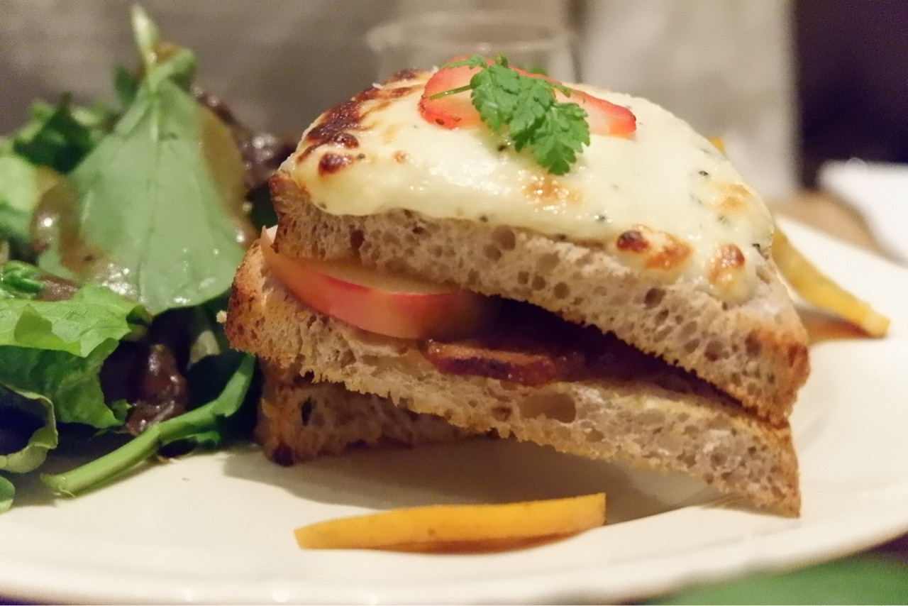 香ばしい甘辛醤油とシナモンでマリネしたローストポークと林檎をクルミブレッドでサンドし、チーズフォンデュソースをのせて焼き上げました。アップルソースとともに。