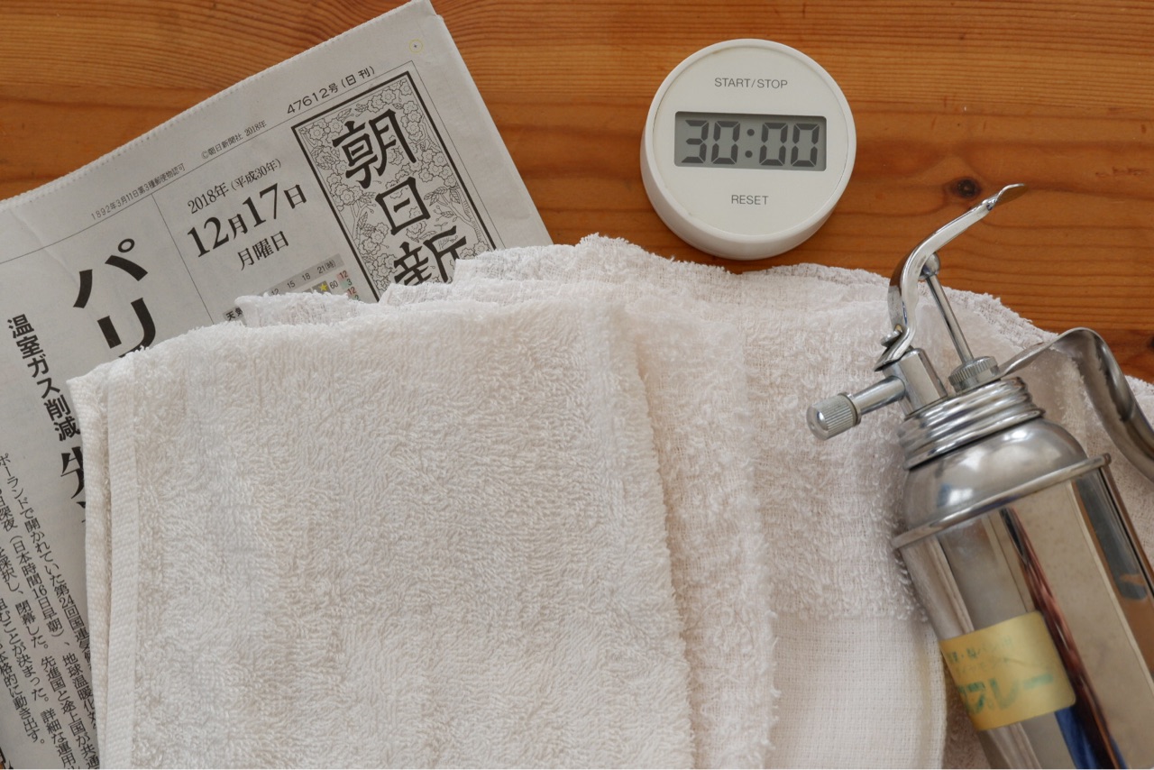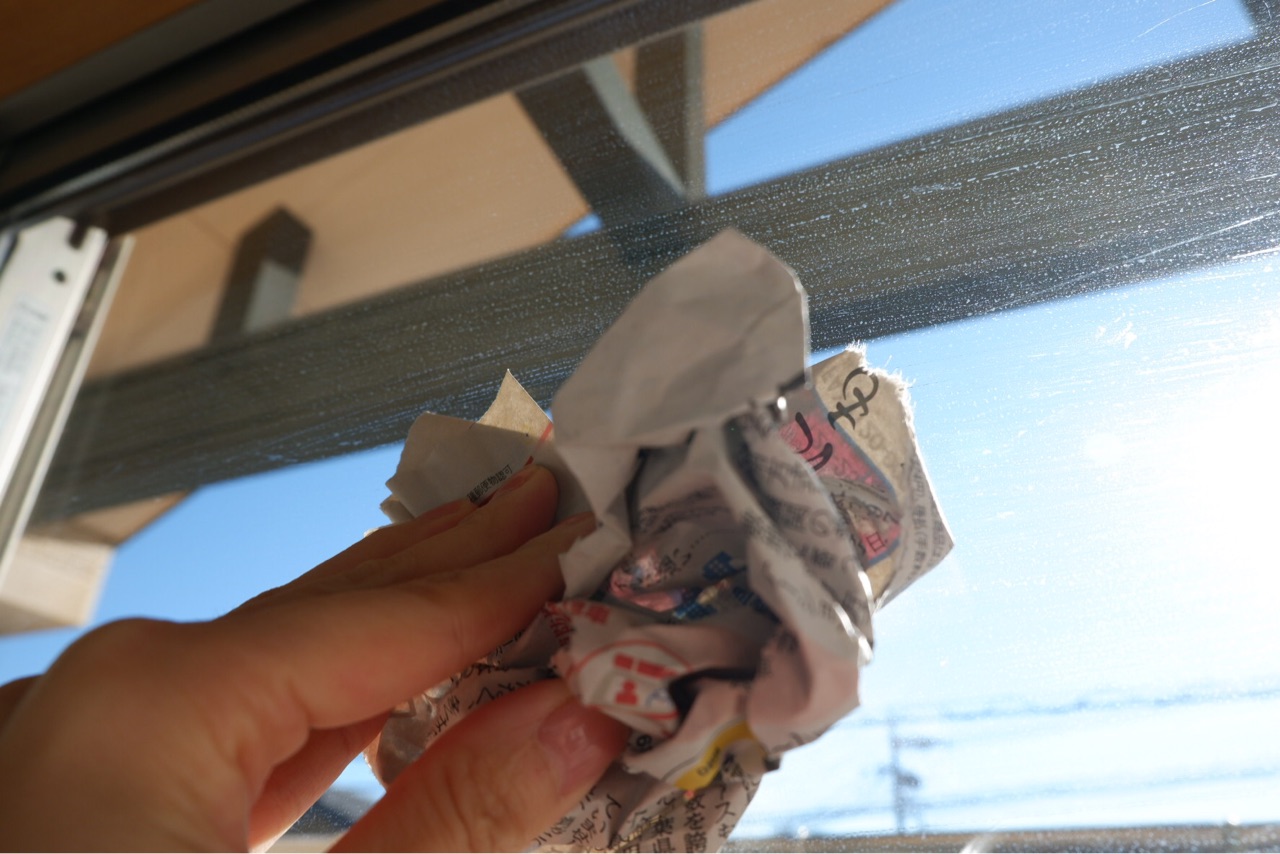 新聞紙で乾拭きします。