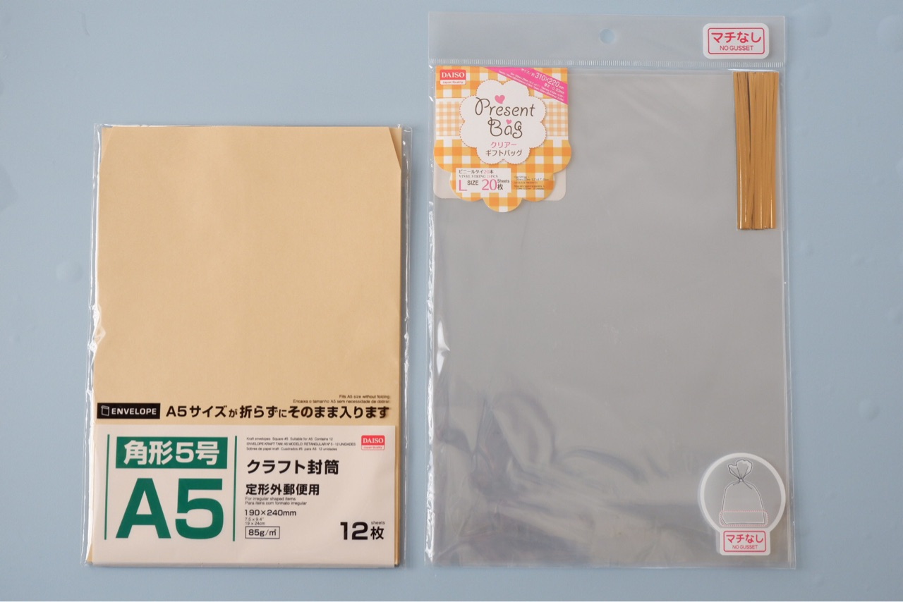 *今回は、茶封筒(クラフト封筒)と透明袋で梱包します♪ ←100均で売っています