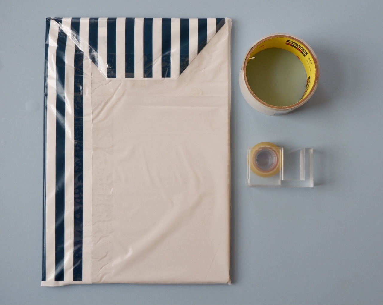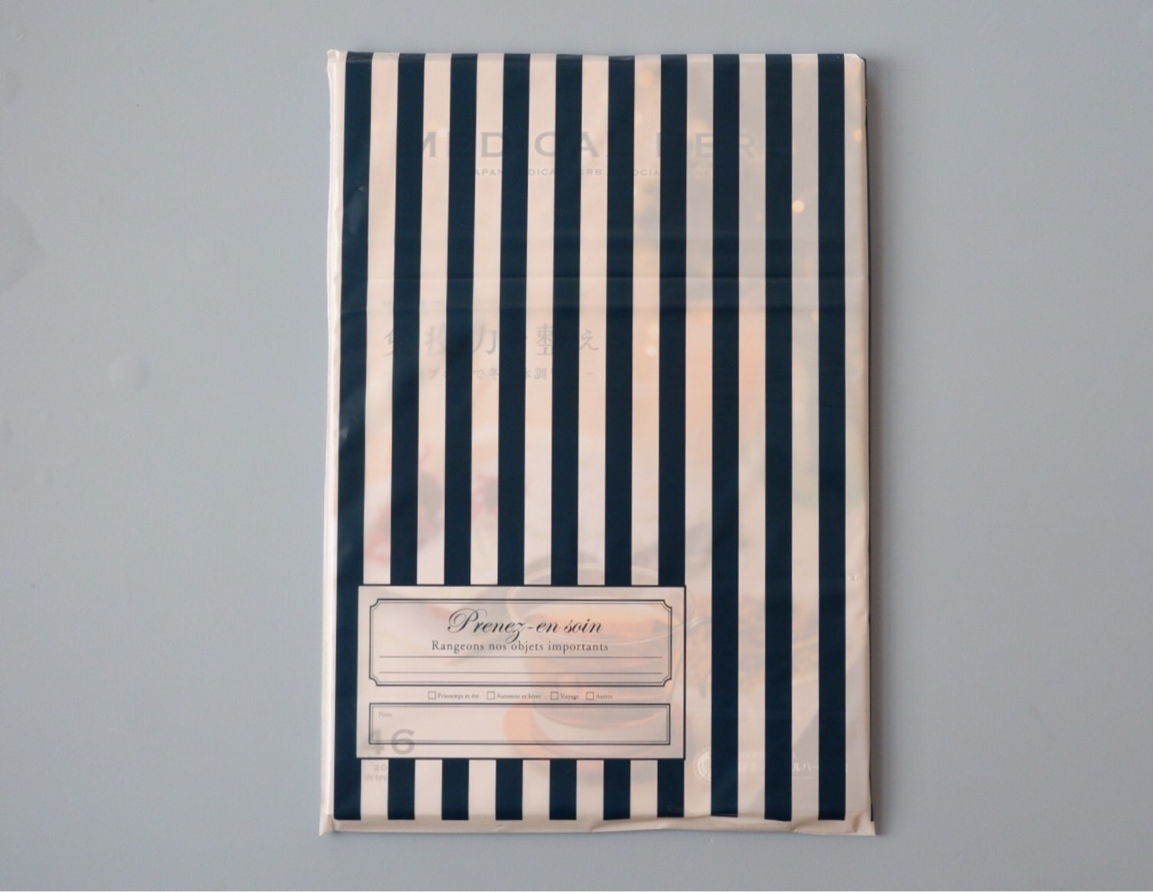 本は念のため、透明袋で梱包してから、このストライプ袋に入れます。