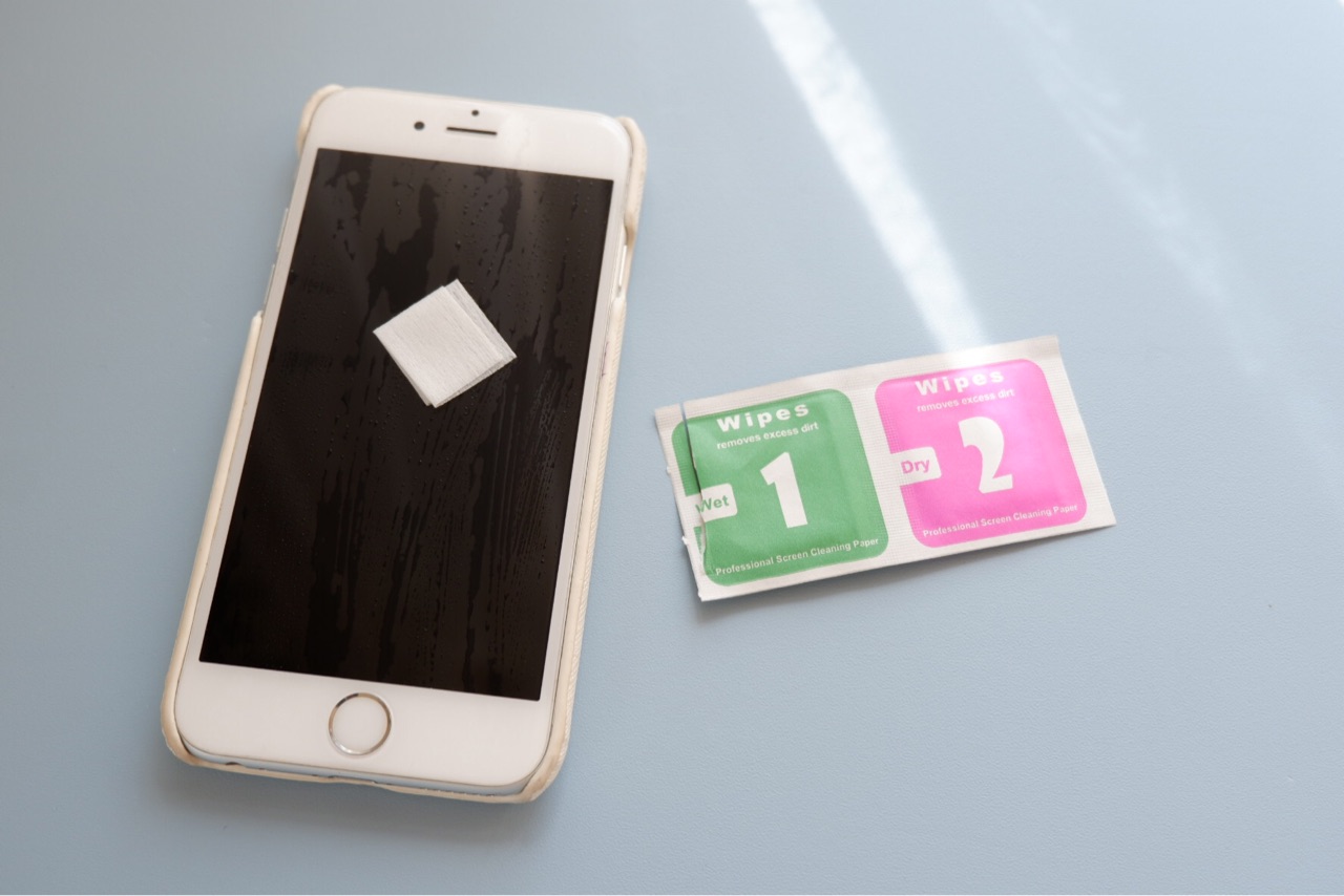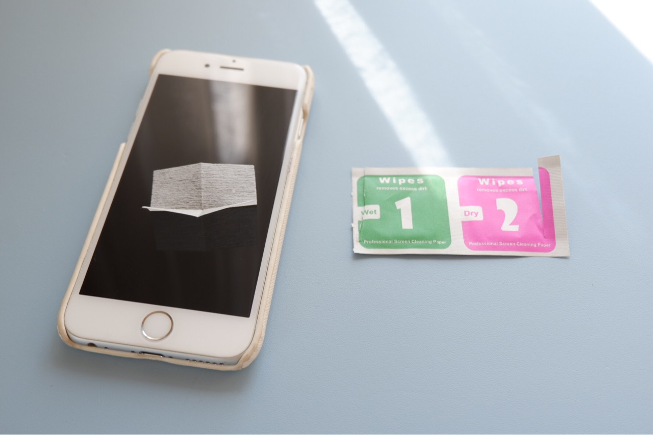 【緑1】のウェットシートでスマホをきれいにする。