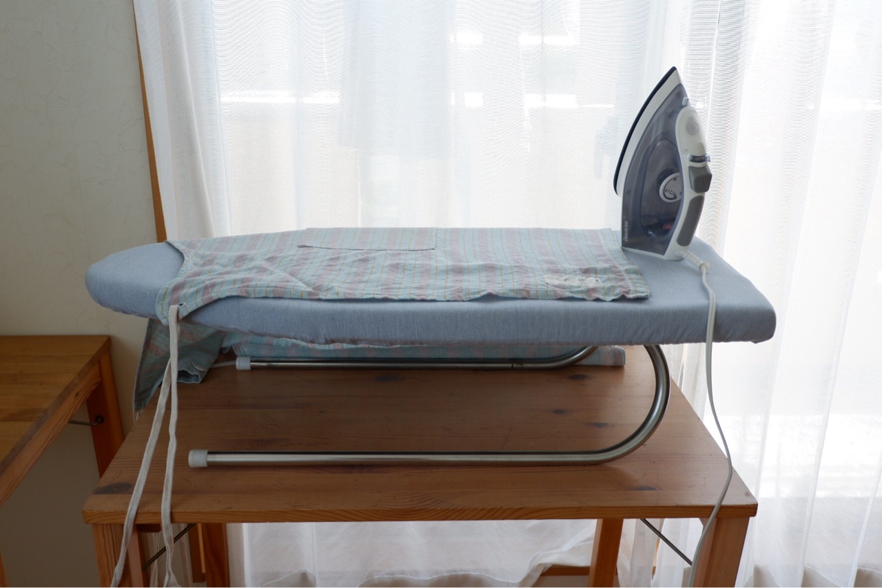 ちなみに、私は、無印良品の折りたたみテーブルの上にアイロン台を置いて