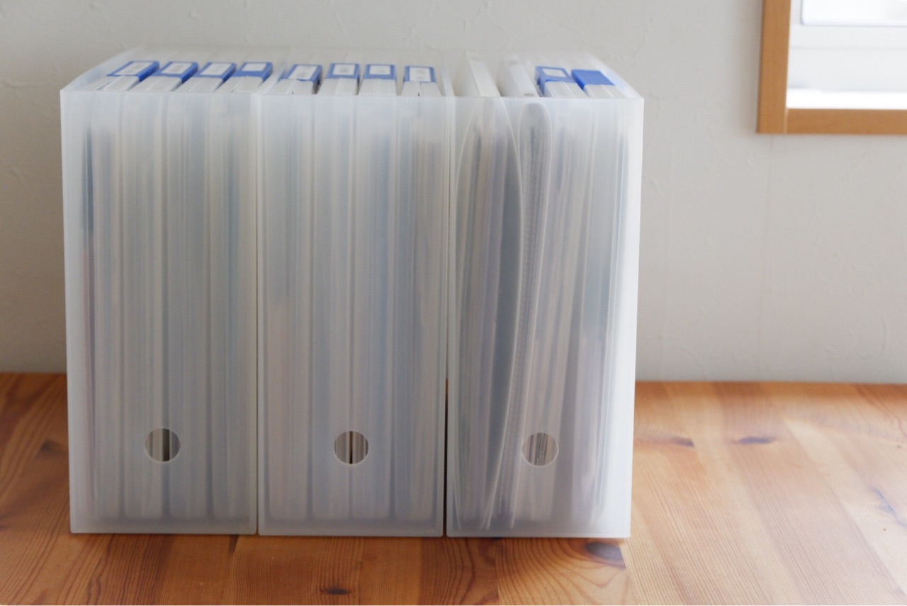 クリアファイルから紙ははみ出してしまうけれど、1つの種類をまとめて入れられるように。