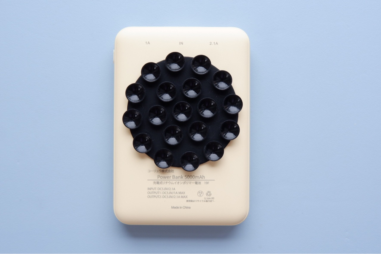 吸盤の裏のシールをはがして、モバイルバッテリーに付けて・・・