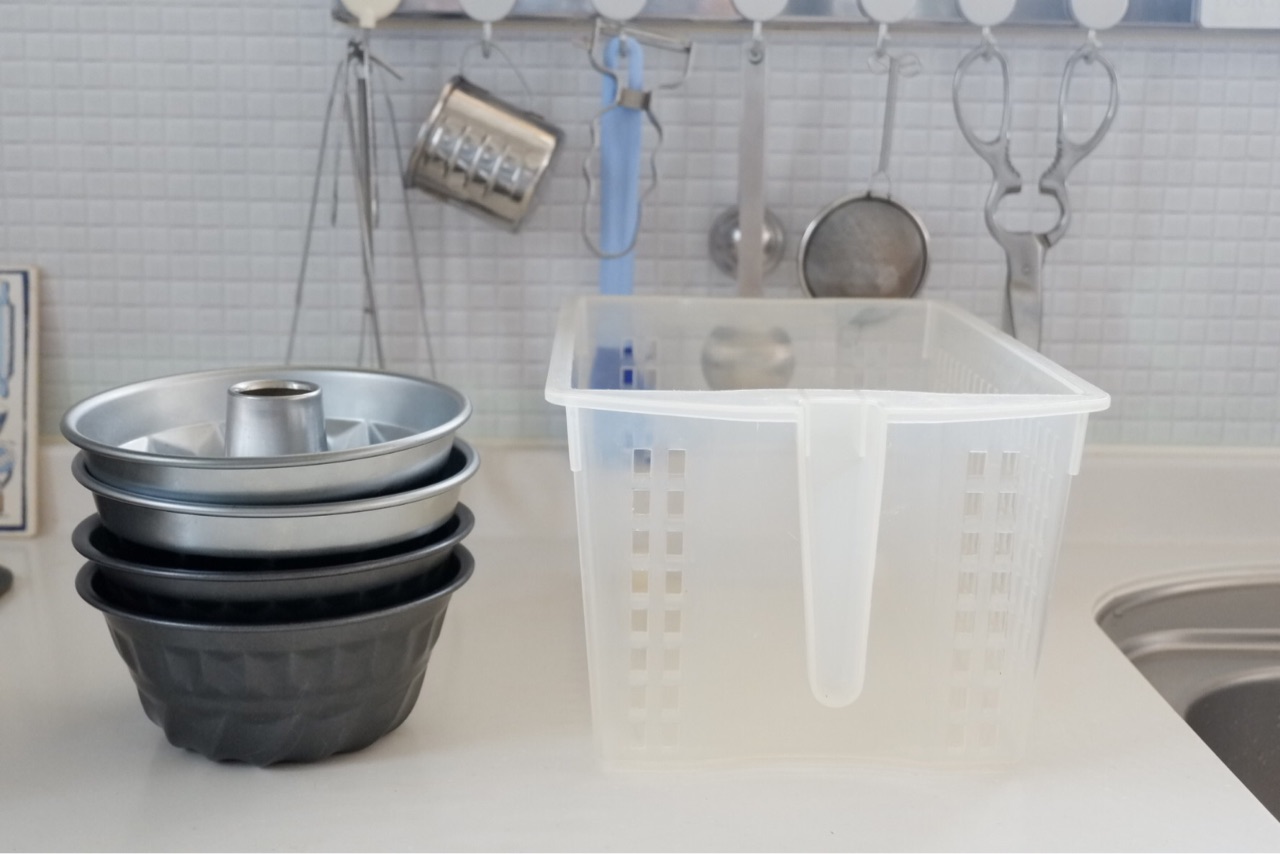 キッチンシンクの上の棚、左にはパンの型を入れています。