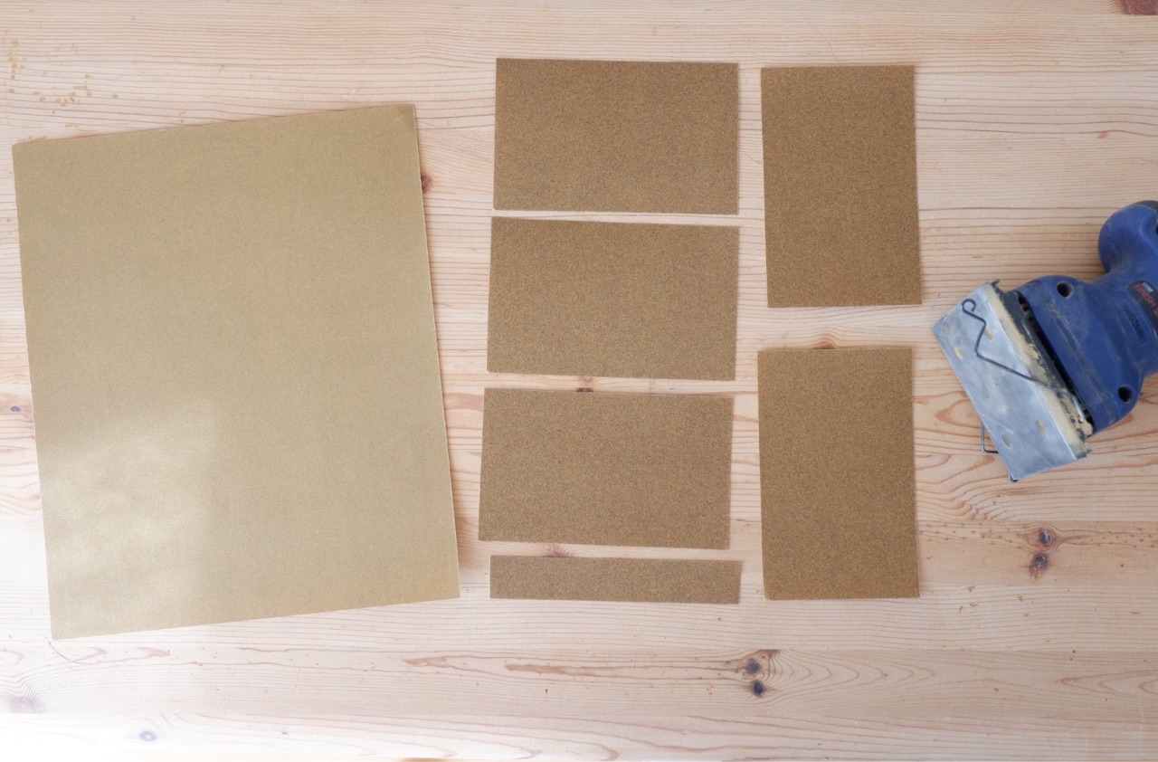 カインズのサンダー(当時3500円程度)に合わせて、1枚30円の紙やすりをカット。