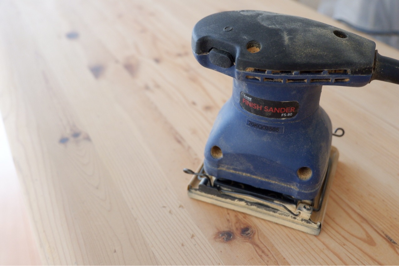 以前、ダイニングテーブルをDIYしたサンダーを使って、表面を削ることに。