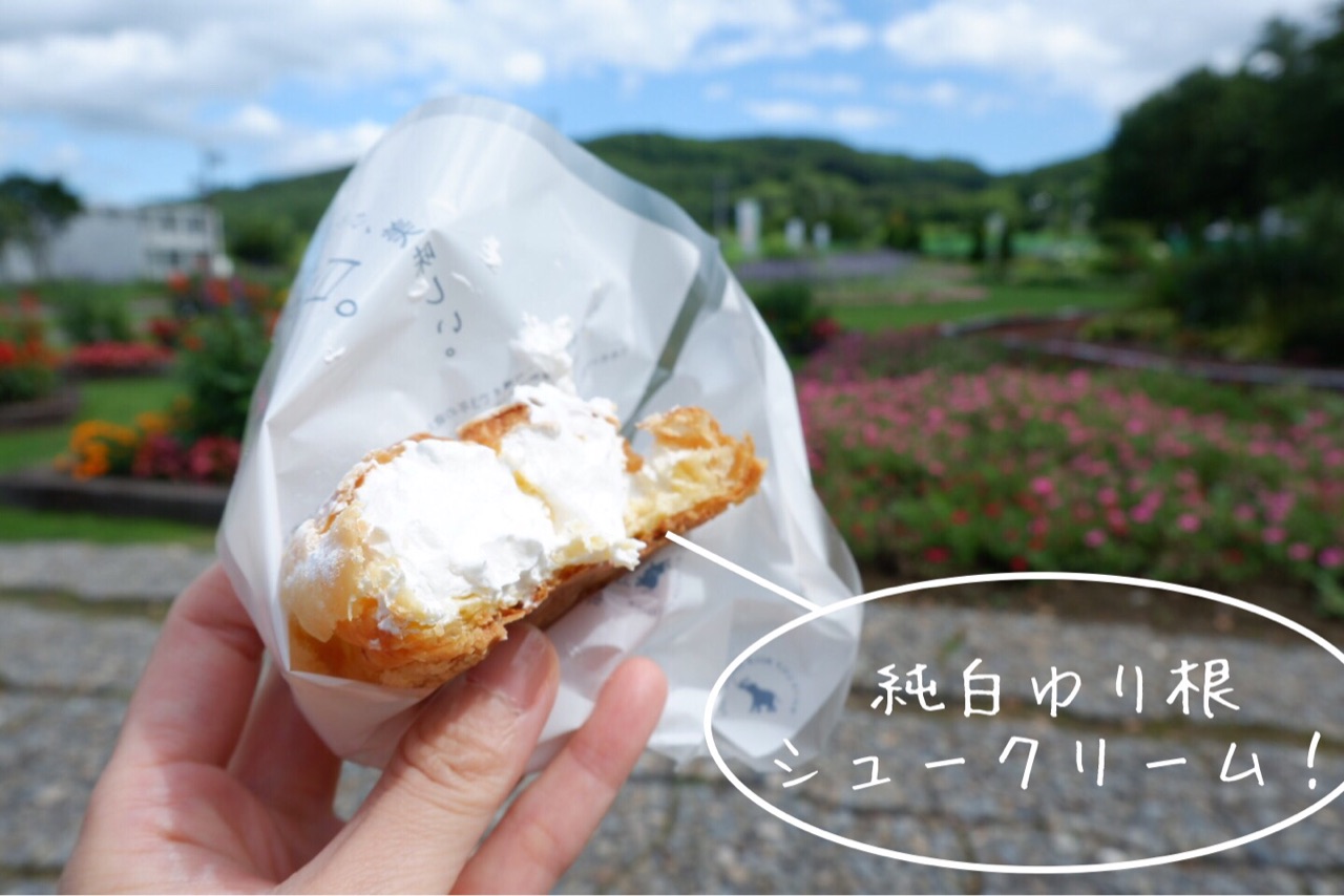 友人が買ってくれた「純白ゆり根シュークリーム」を裏の公園で食べることに♪