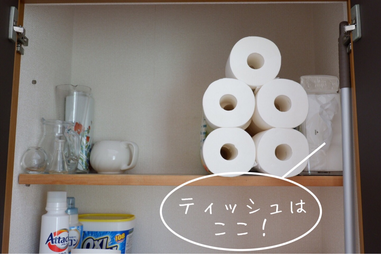 ちょうど、洗面所の後ろがティッシュの予備置き場。