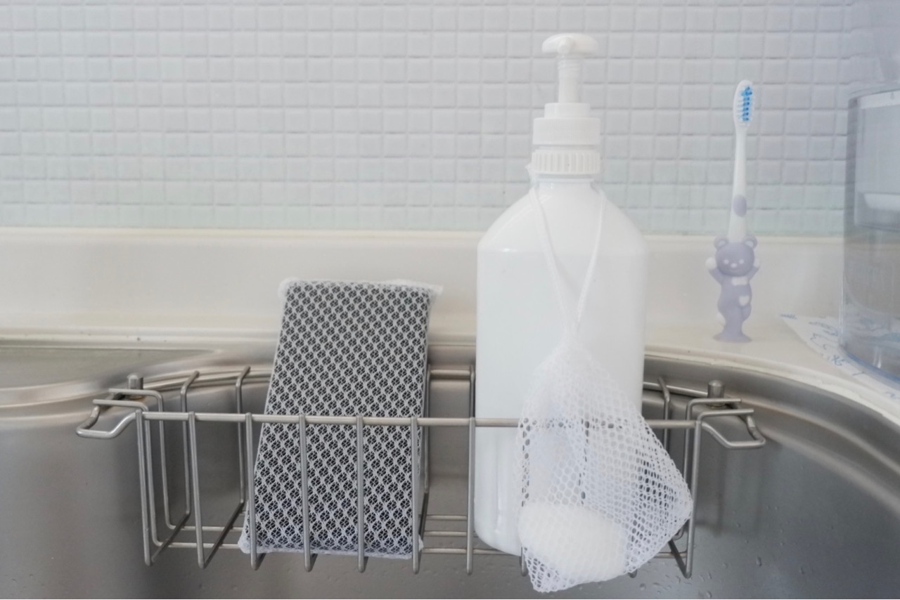 洗剤を置いているカゴにフックをつけてぶら下げるのも