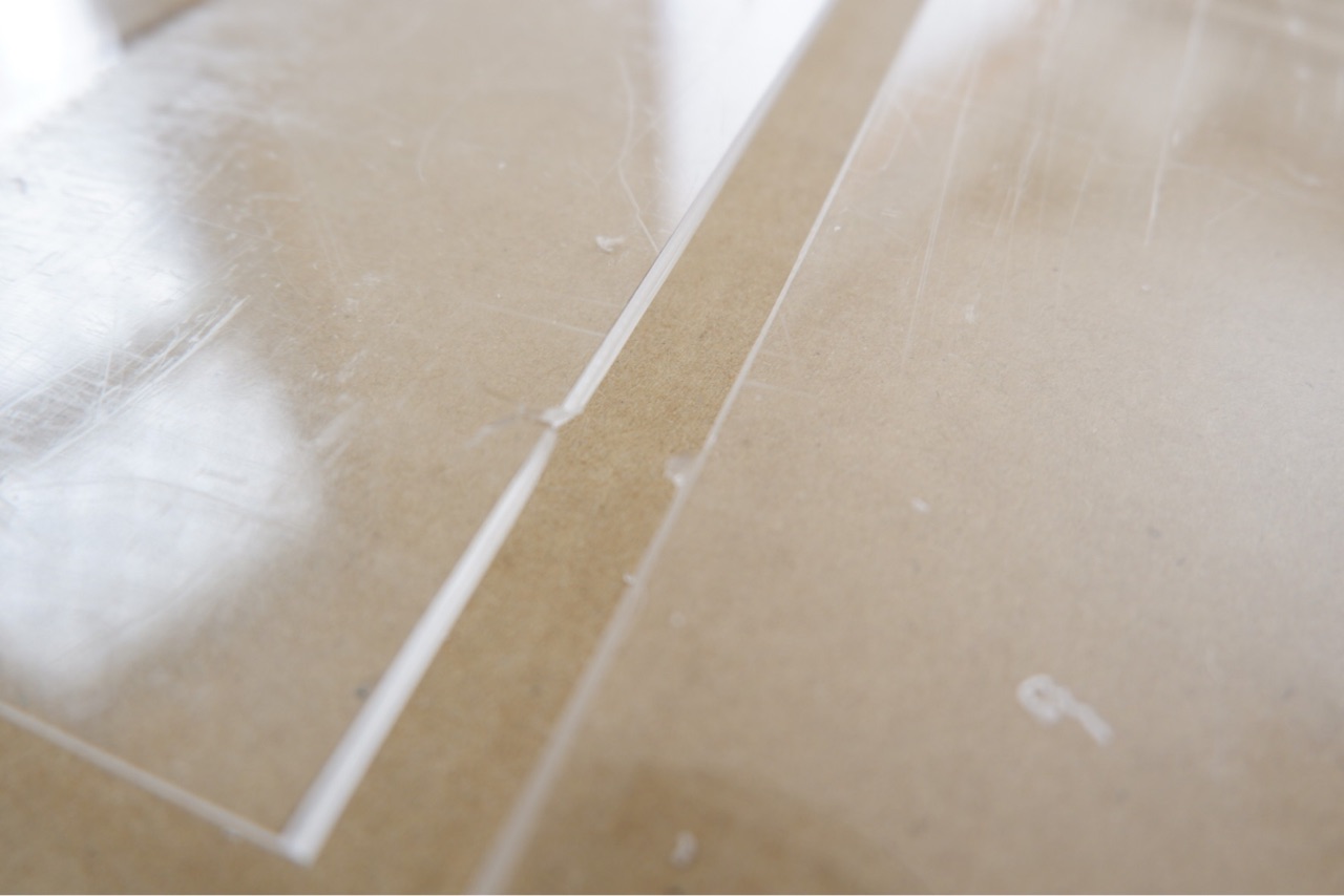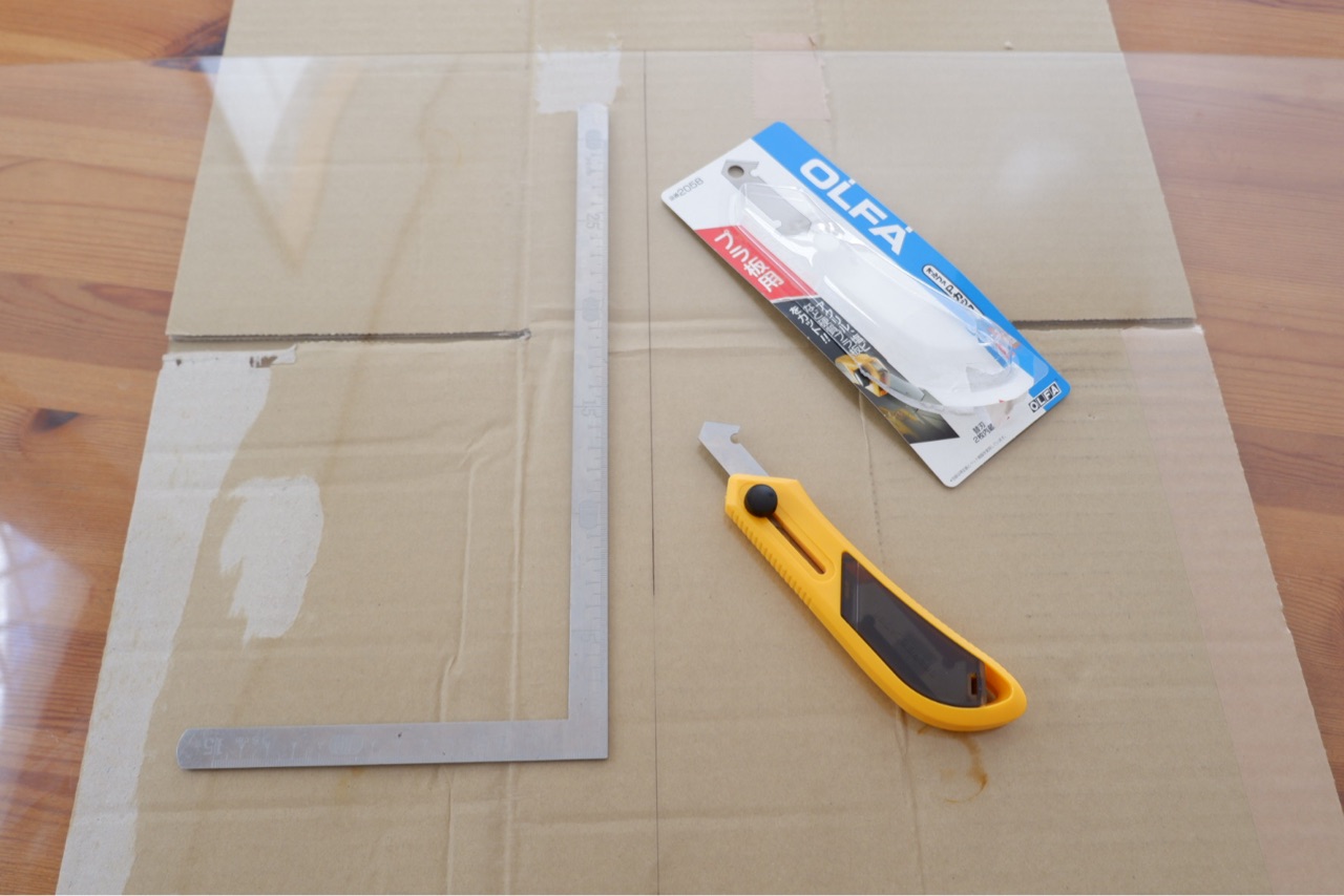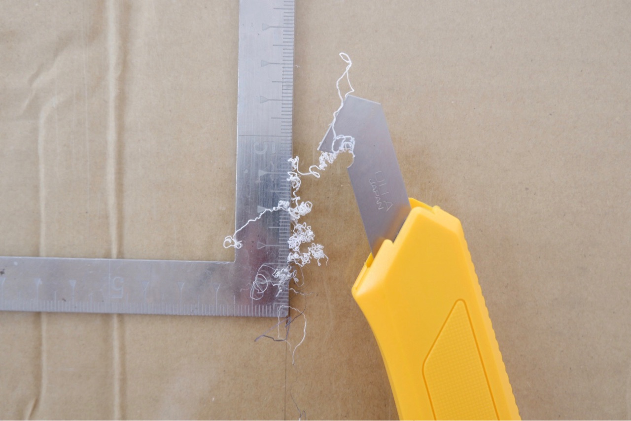 段ボールの上で、プラ板用カッターでアクリル板をカットします♪