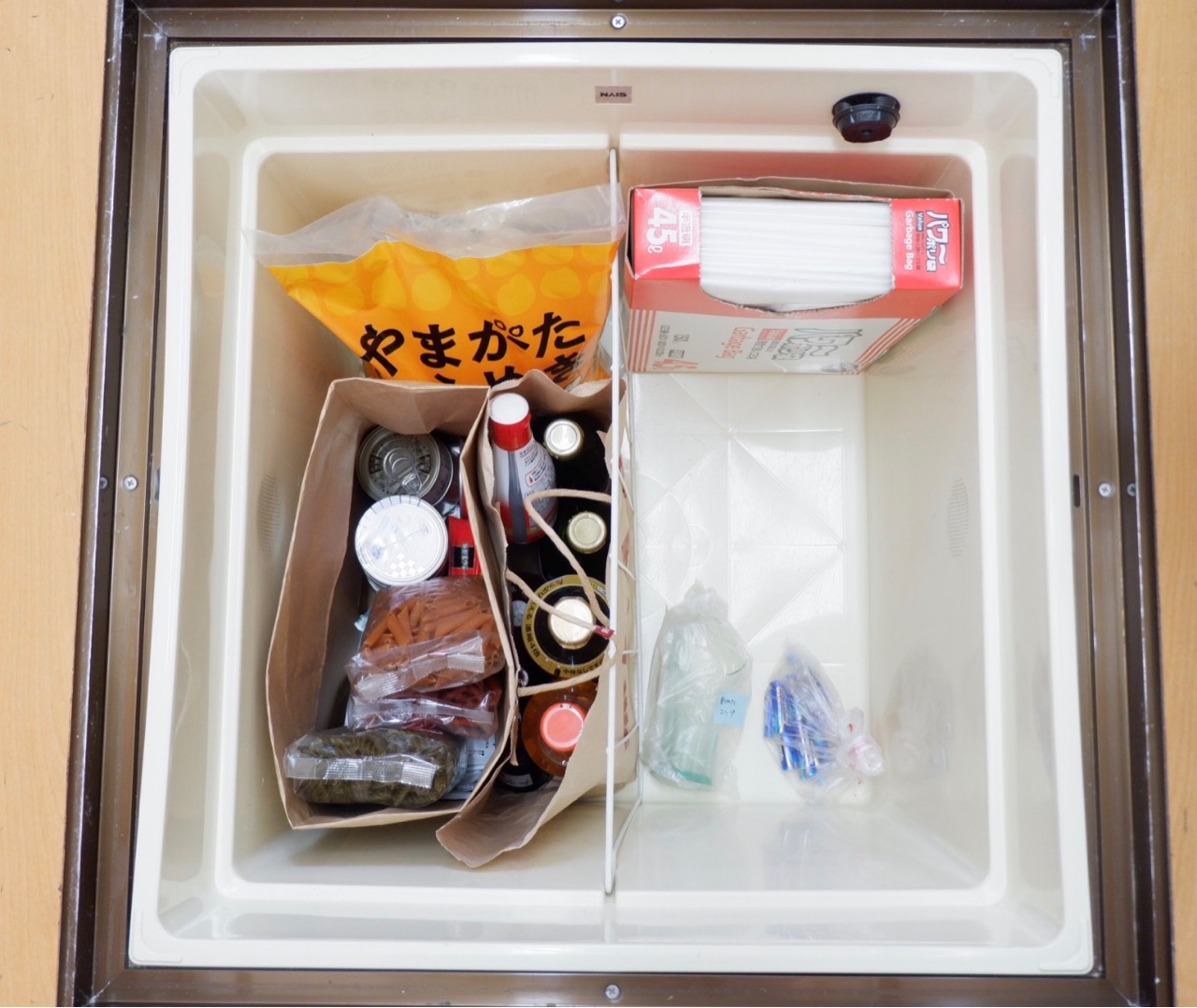 備蓄の食料は、袋の上まで収納してもよさそう。