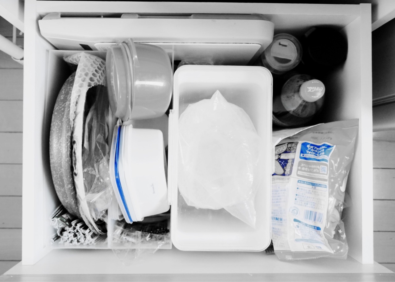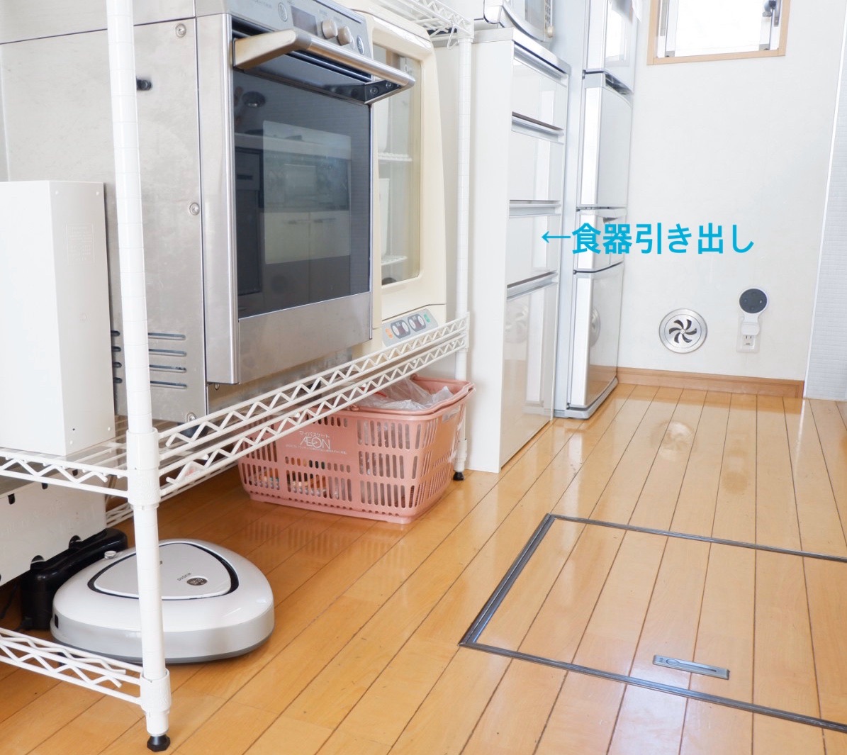 冷蔵庫とスチールシェルフの間にある引き出し収納に