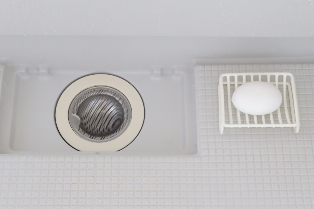 で、排水口の横には石けんを置いていて洗顔&掃除に使っています。