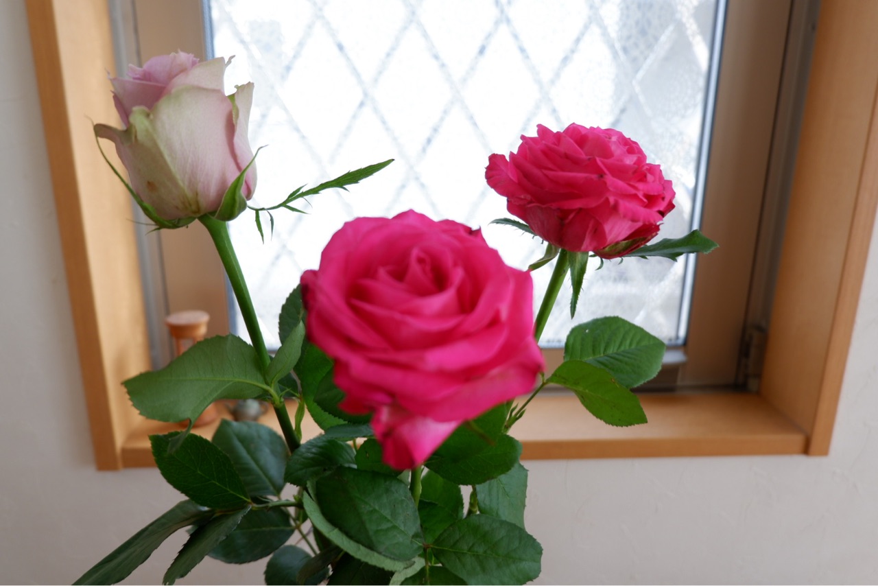 数日楽しめたショッキングピンクのバラも一緒に活けて