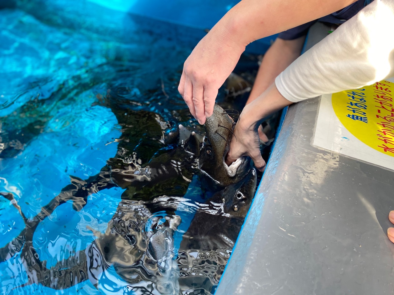 係員の方の強い勧めにより、チョウザメの口に手を入れることになりました^^;