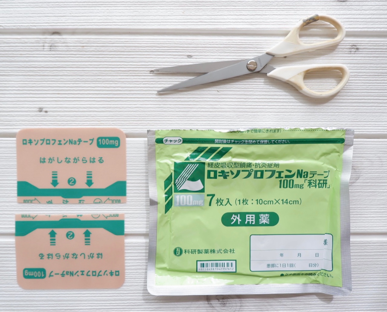 病院から処方された温湿布とハサミを用意。(慢性化しているので温湿布で温めています)