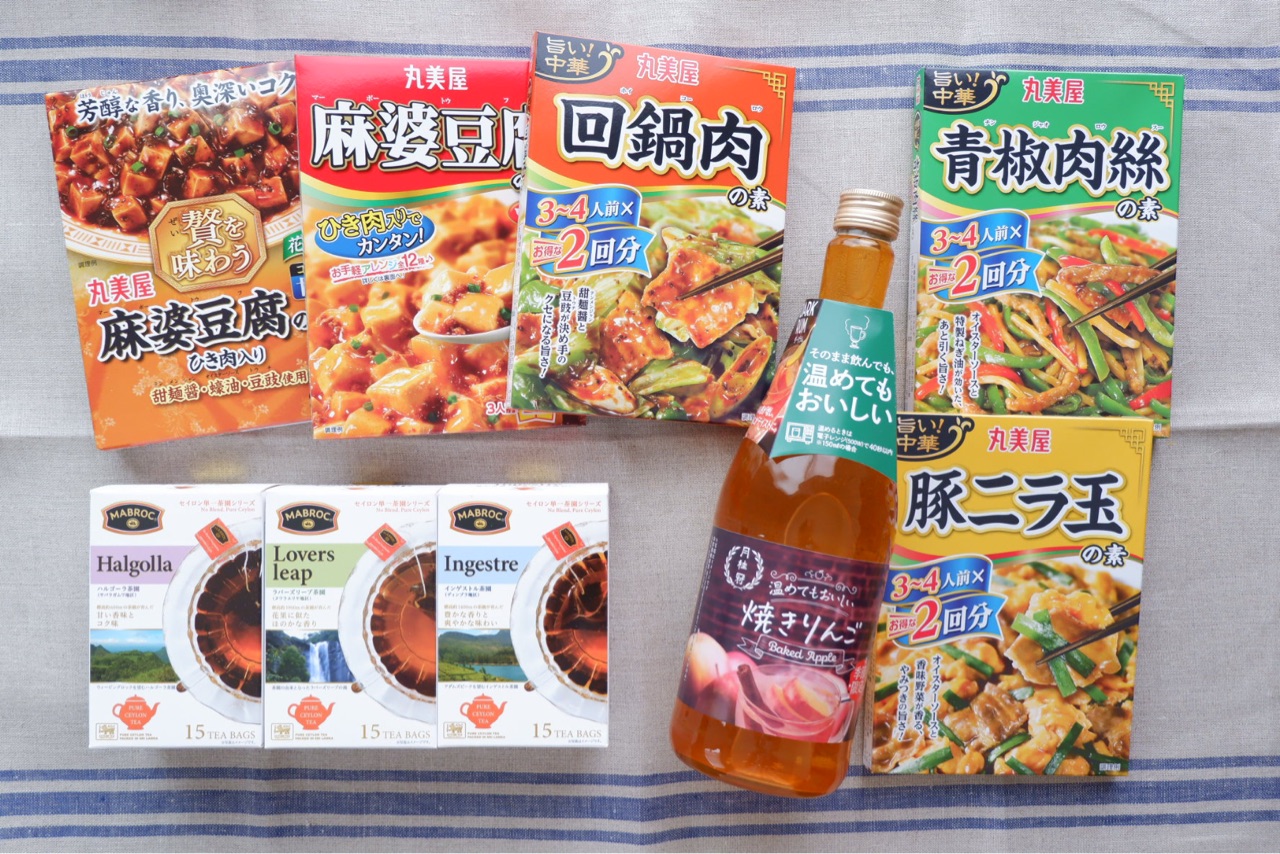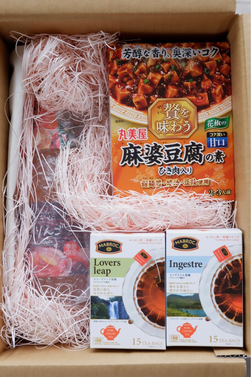 紅茶が3箱も。丸美屋製品が5箱も。お酒も大きい瓶!