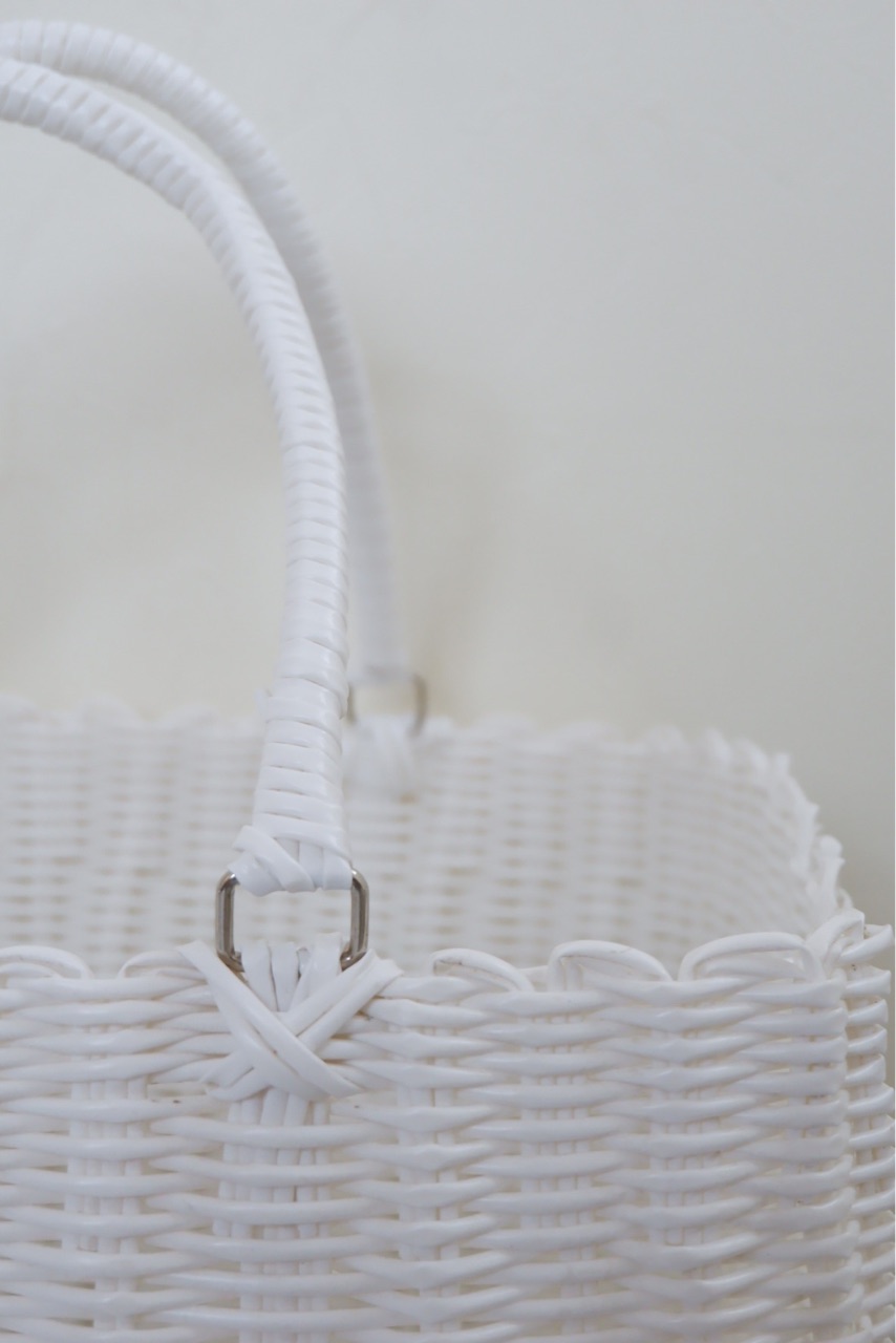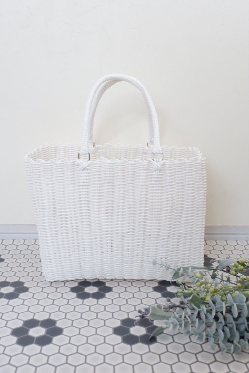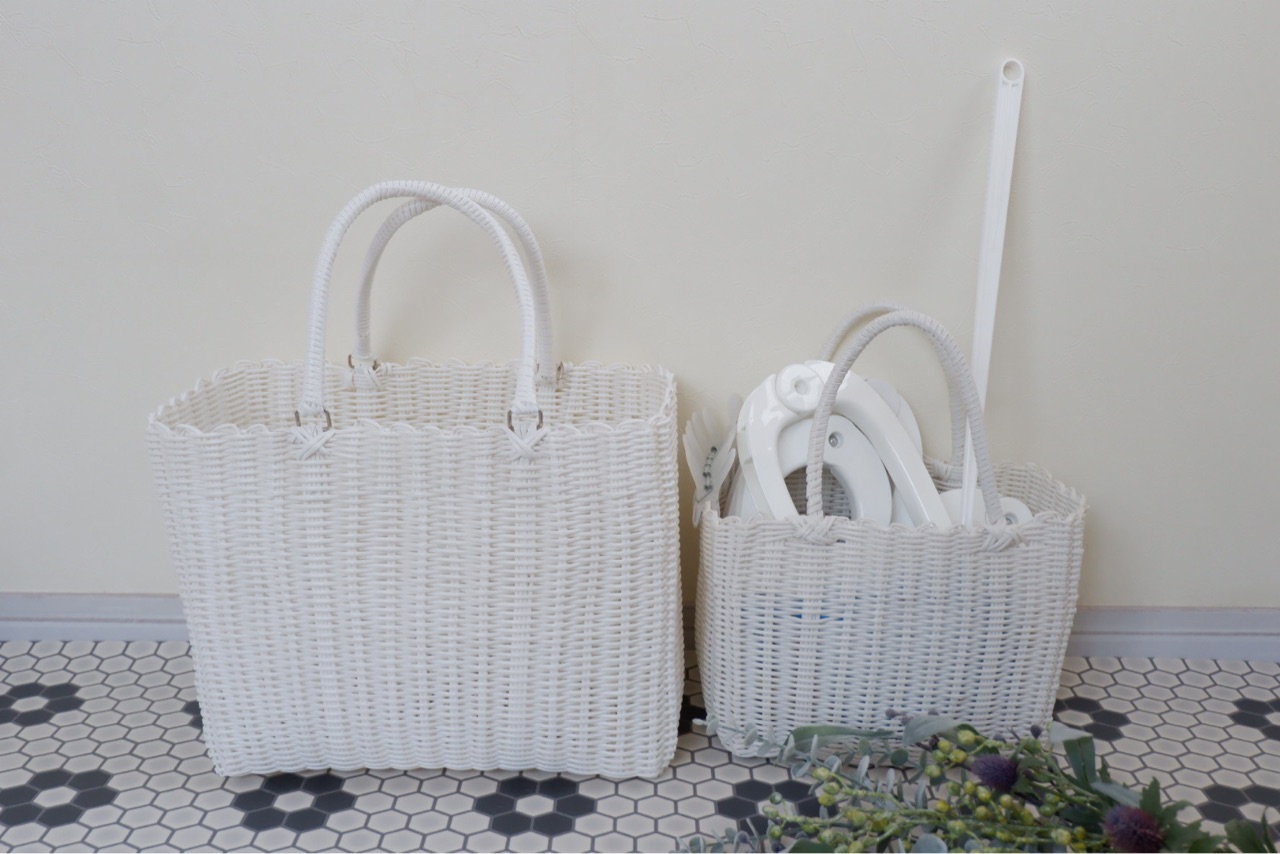 我が家では、お出かけや荷物入れ、トイレに活躍しているビニール素材のカゴバッグ。