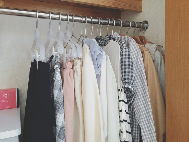 ピンチ付きハンガーにスカートを挟んで、干して、クローゼットに入れるという流れになります。