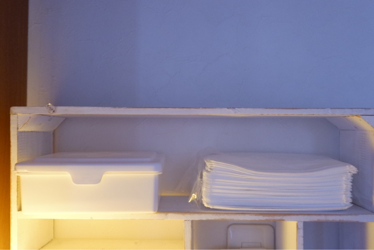 棚の上段にはペット用のウェットティッシュ&マスク。