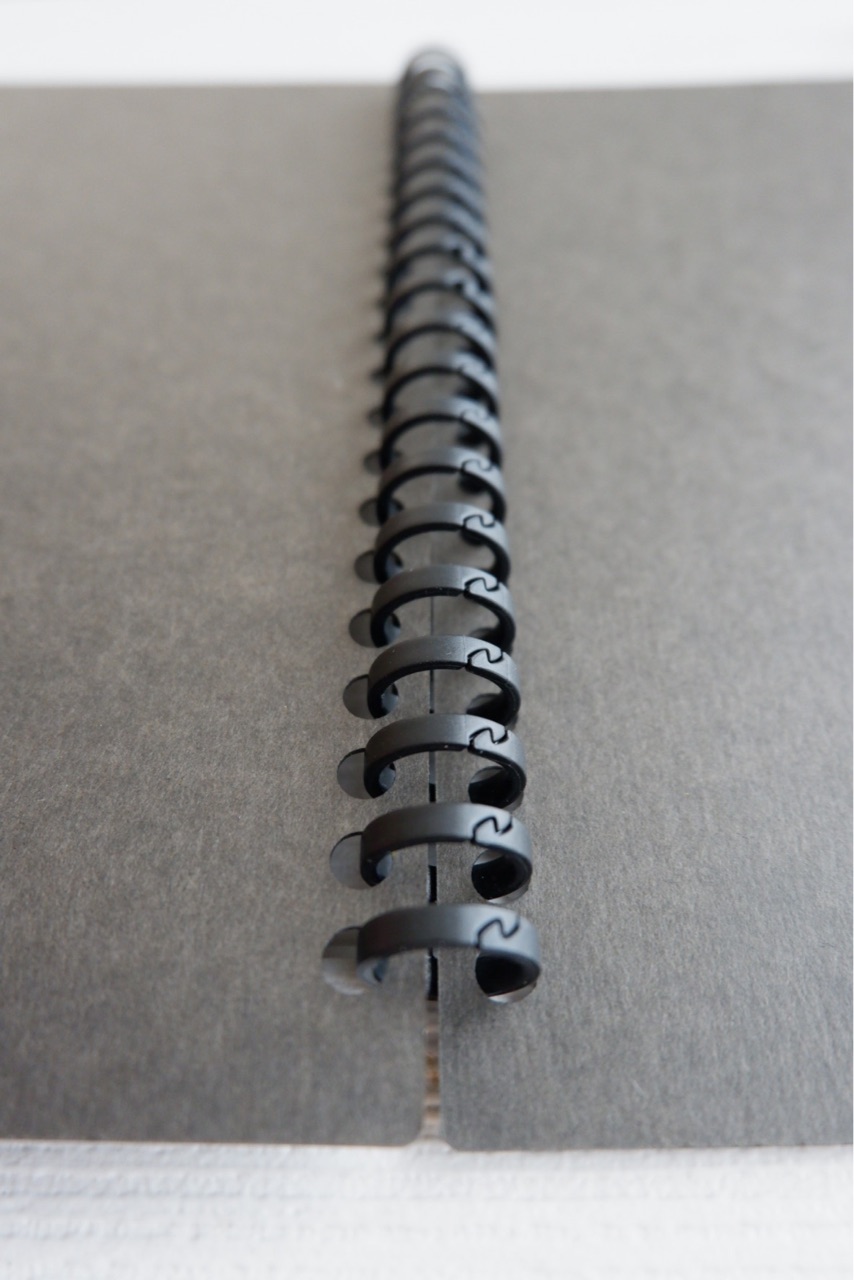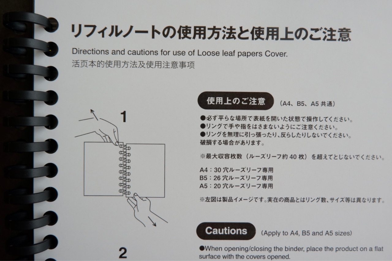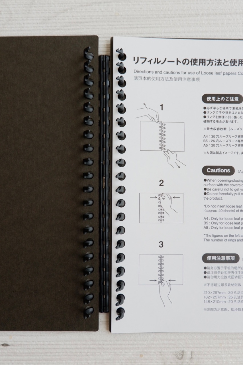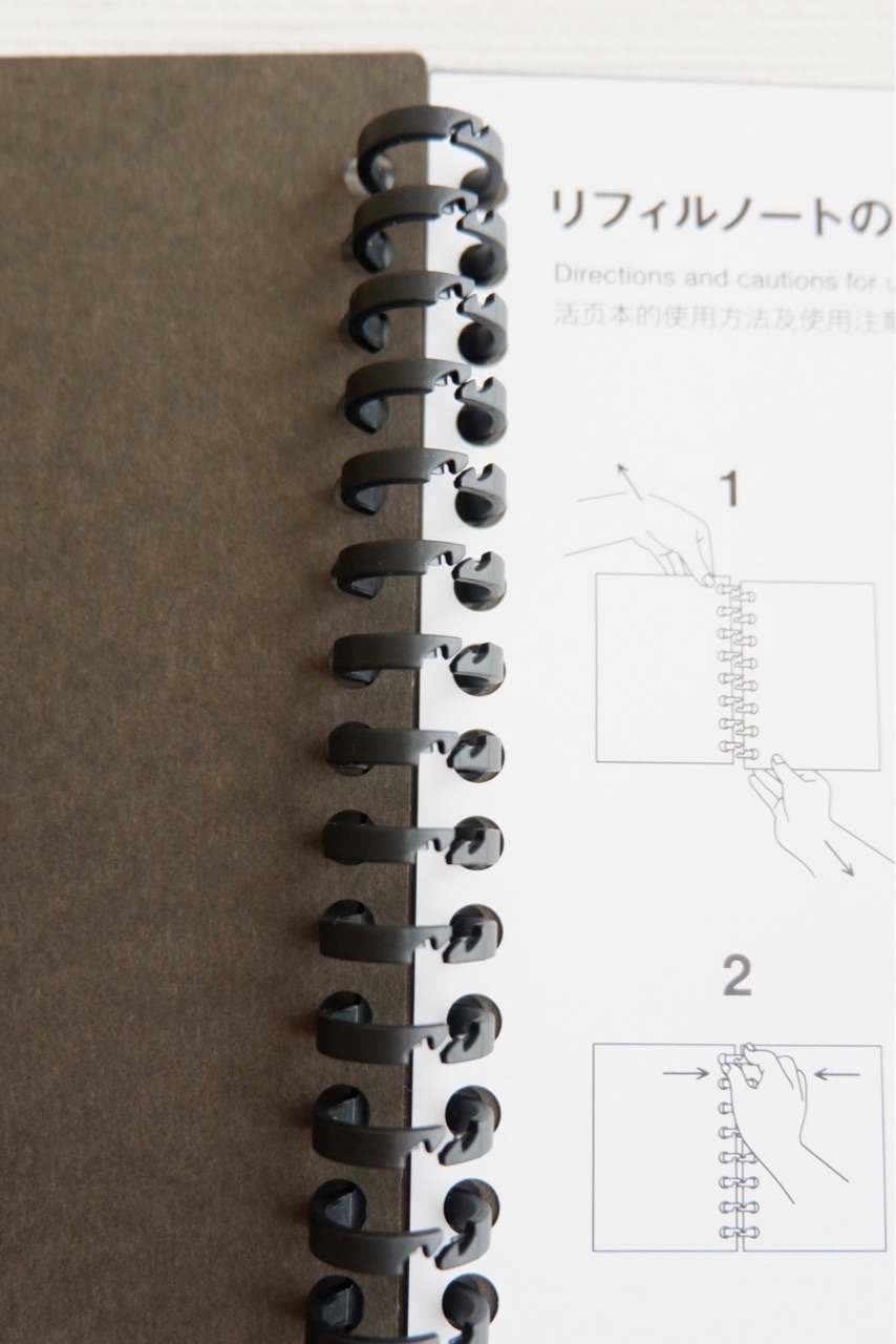 左右のページを上下方向にずらして引っ張りだけで開き、リングを軽くつまんで閉じる仕様です。(無印良品公式サイトより抜粋)