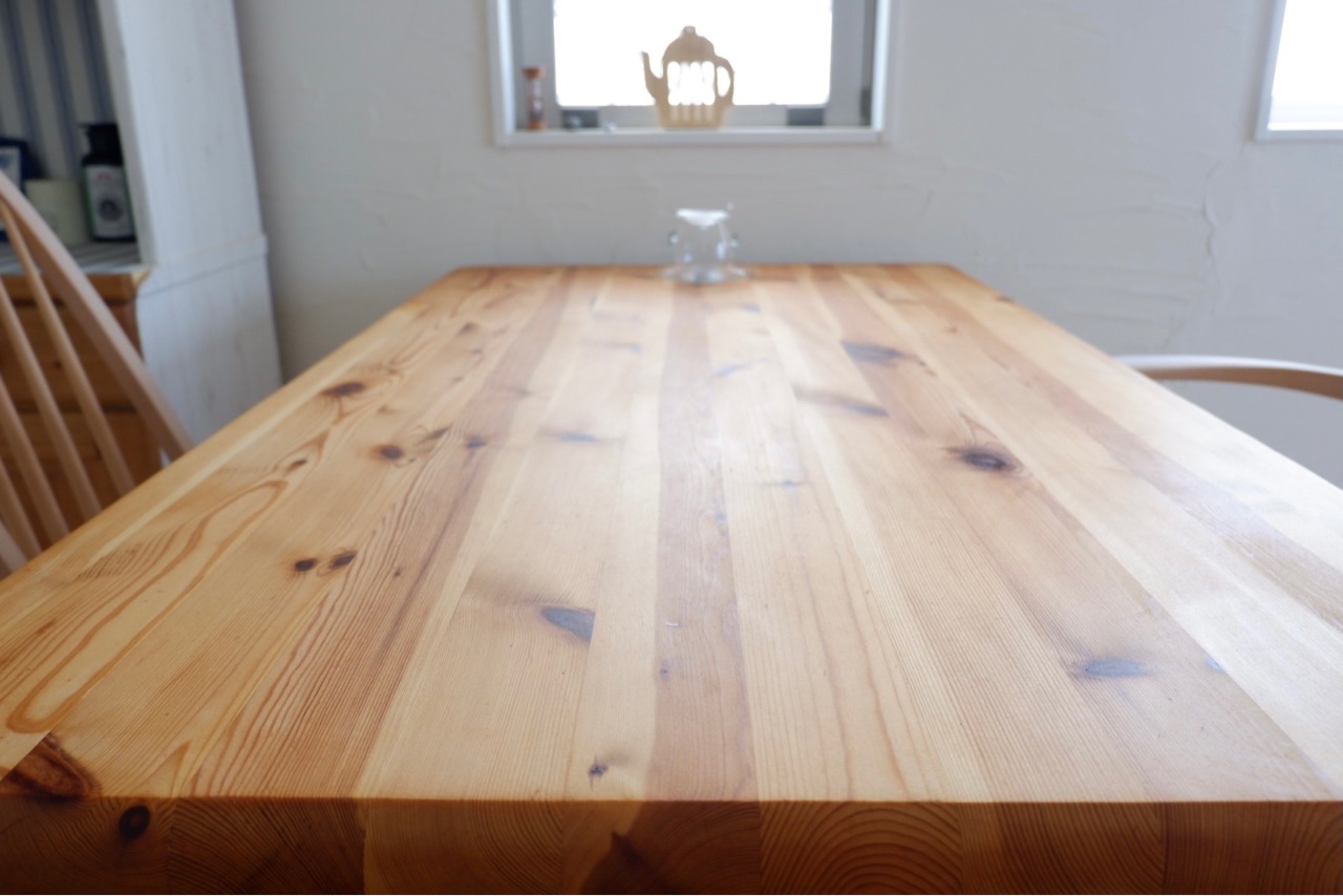 パイン集成材ダイニングテーブルをサンダーで削りました♪
