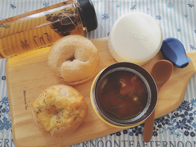 今朝焼いたベーグル2種(プレーン&チーズ)とトマトスープを添えて。