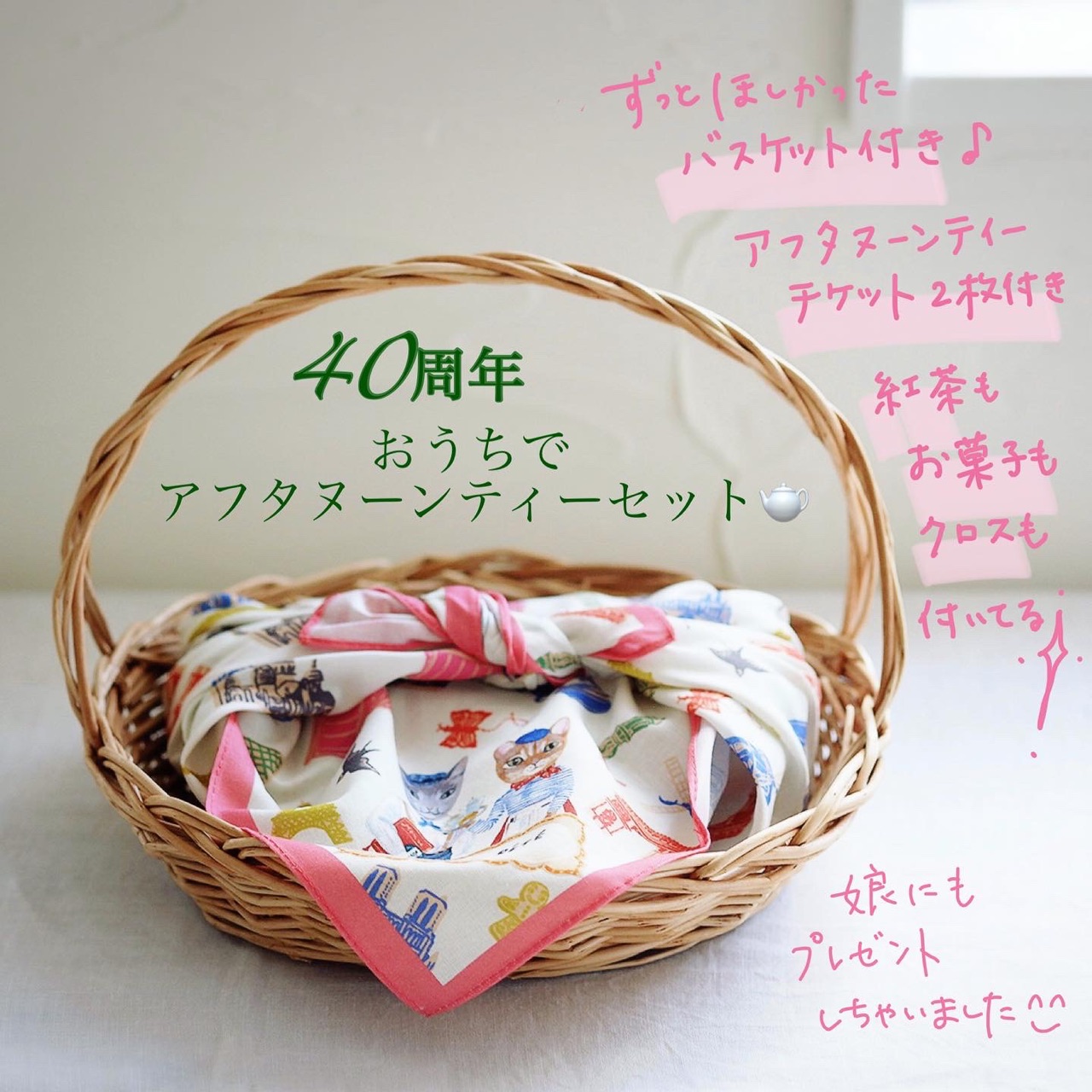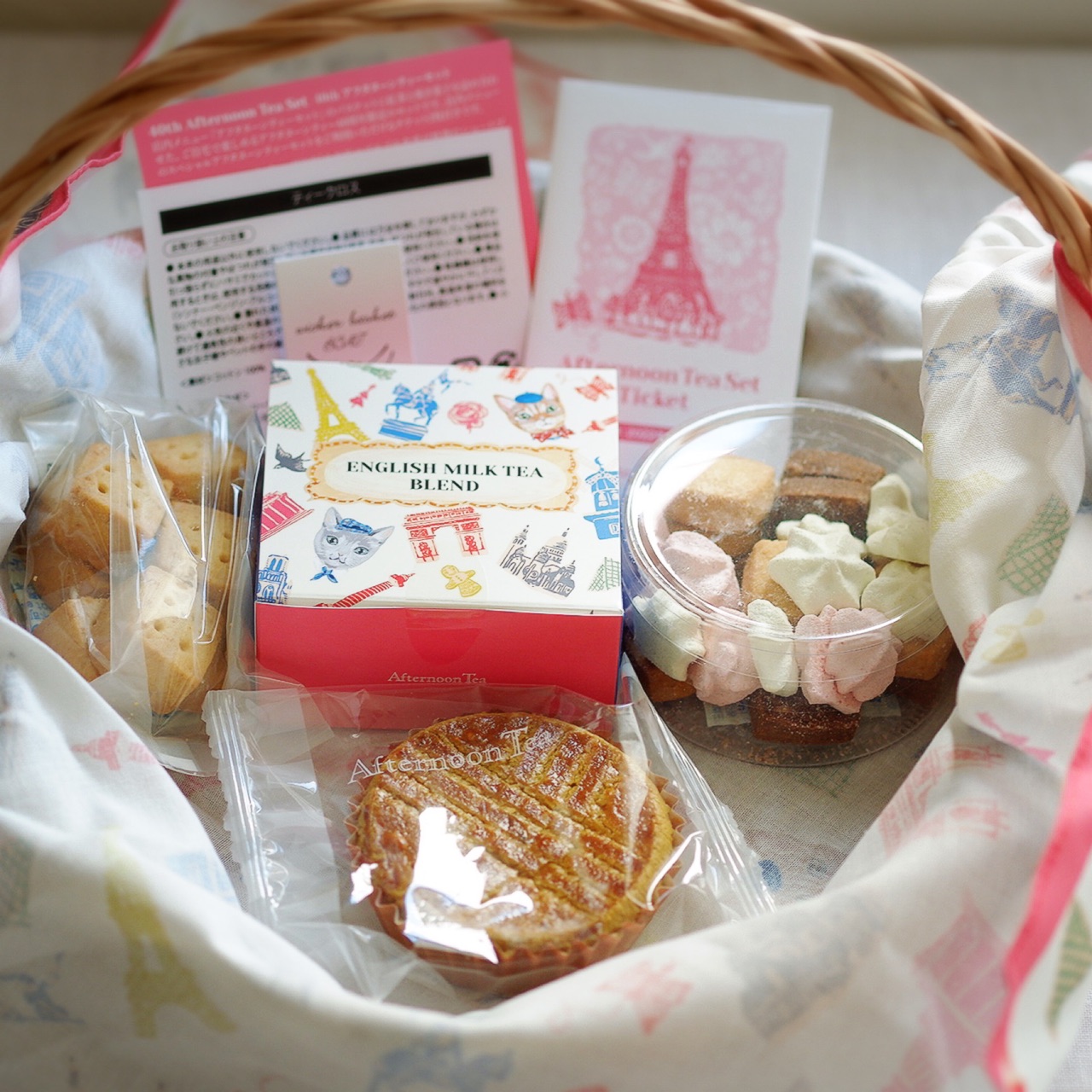 店内メニュー「アフタヌーンティーセット」のバスケットに紅茶と焼き菓子を詰め合わせた、ご自宅で楽しめるアフタヌーンティー40周年限定のセットです。