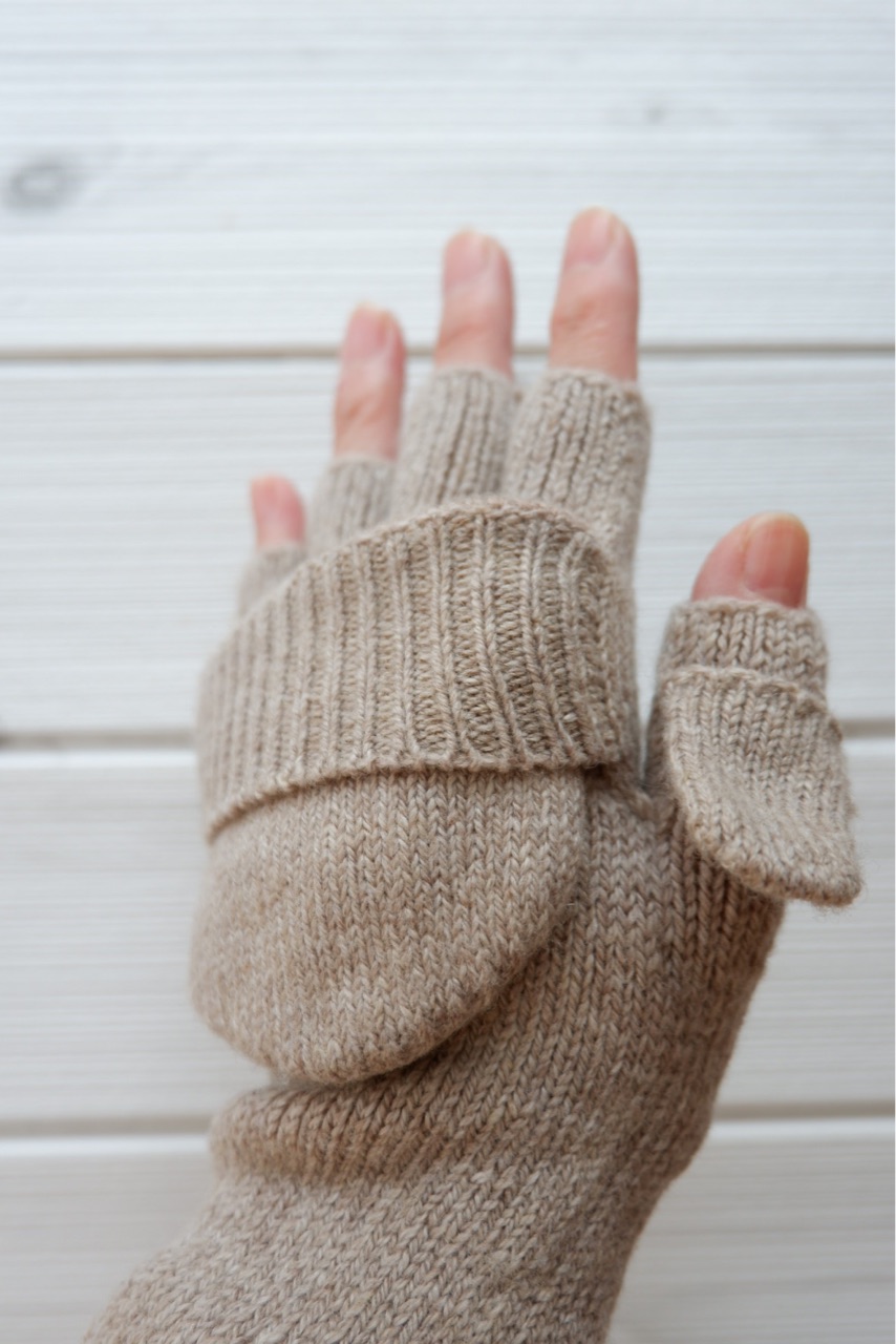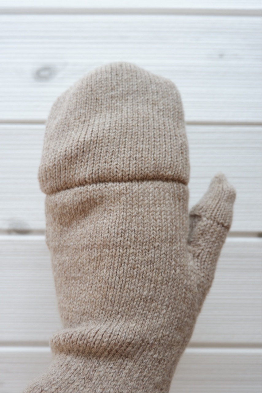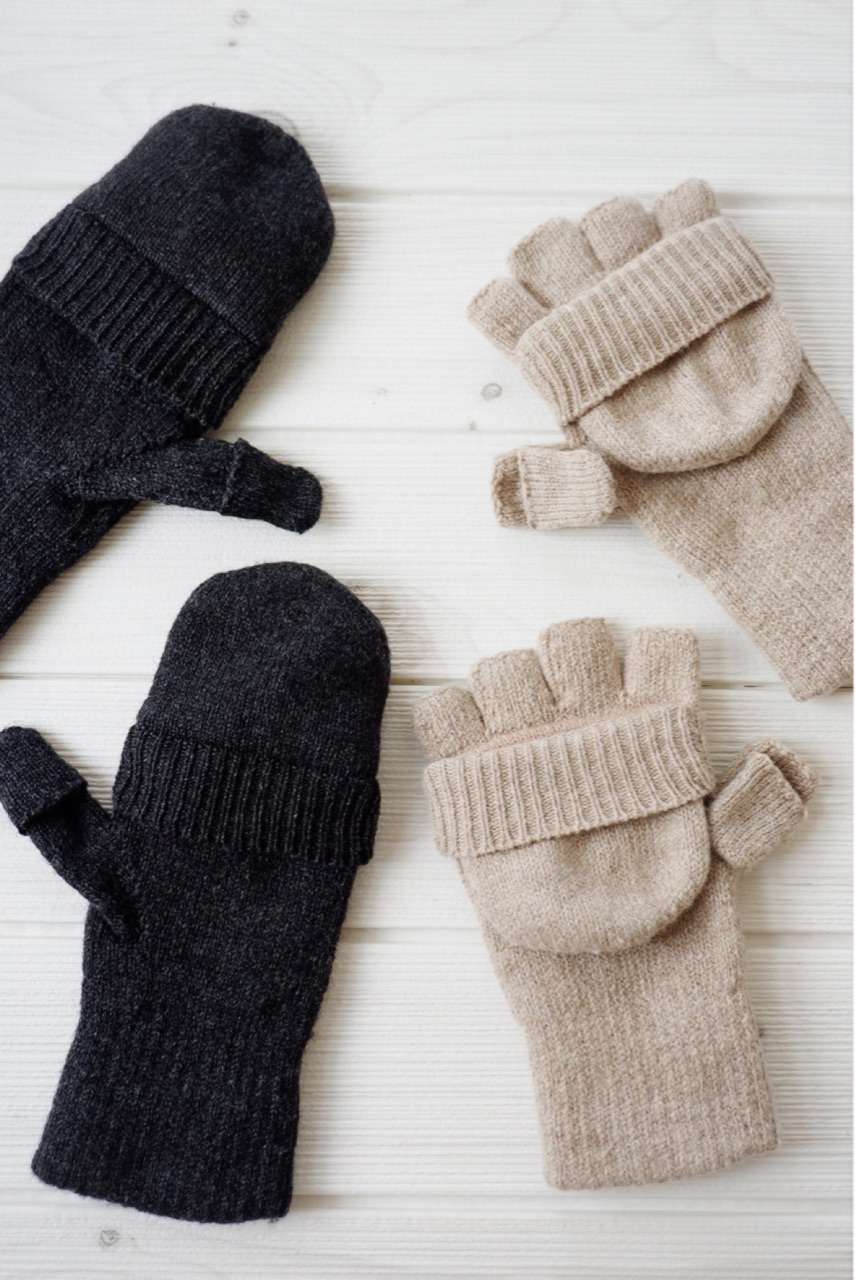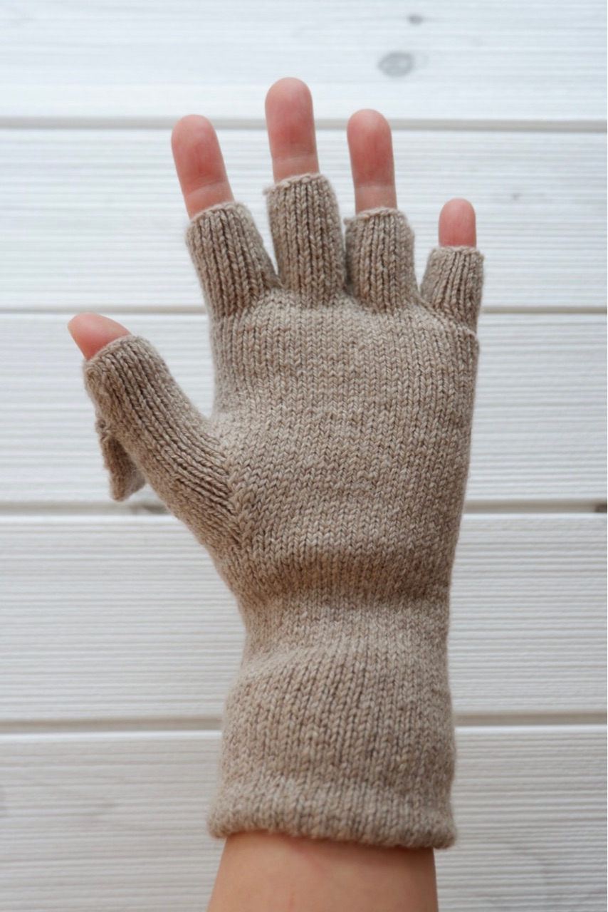 ウール入り素材を編み二重に仕立てた半指手袋。