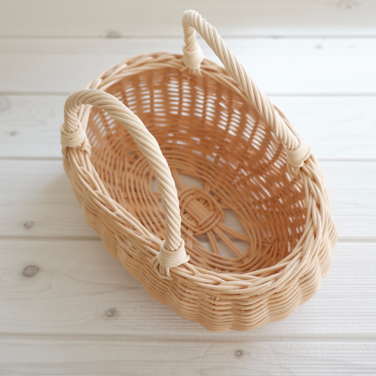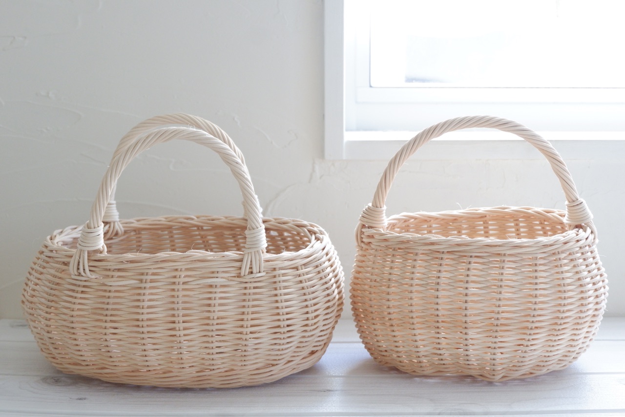 ひとまわり大きいかごがほしくて作ってみた作品(手前)。