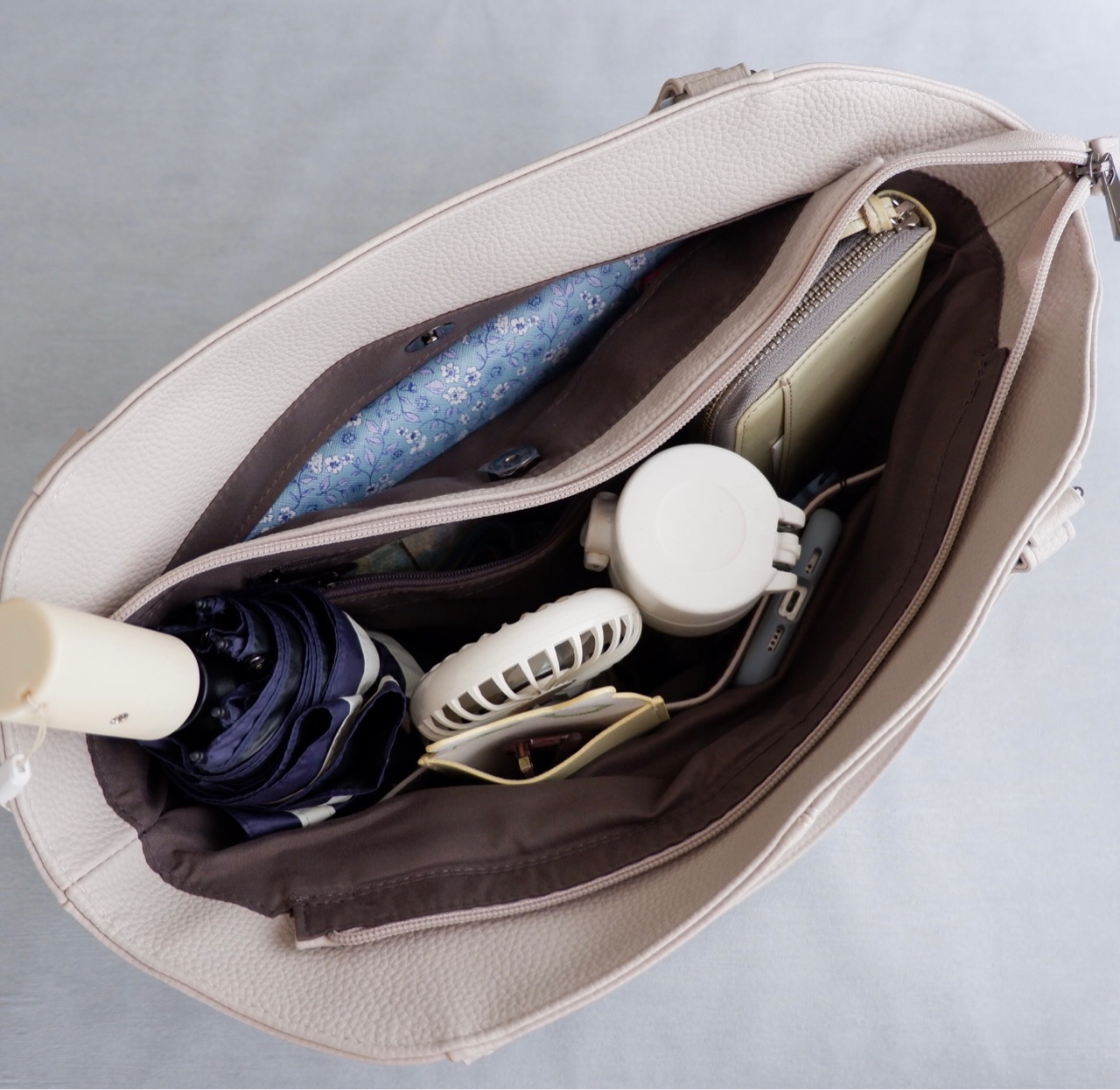 内側:水筒、日傘、ハンディファン、メガネケース、長財布、ポーチ、エコバッグなど
